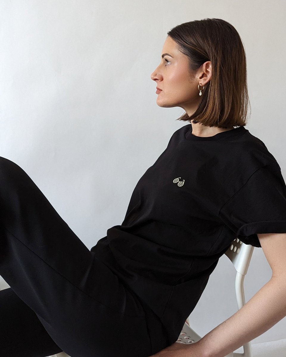 Unisex black t-shirt w/ cream embroidery on wearer's left front chest.