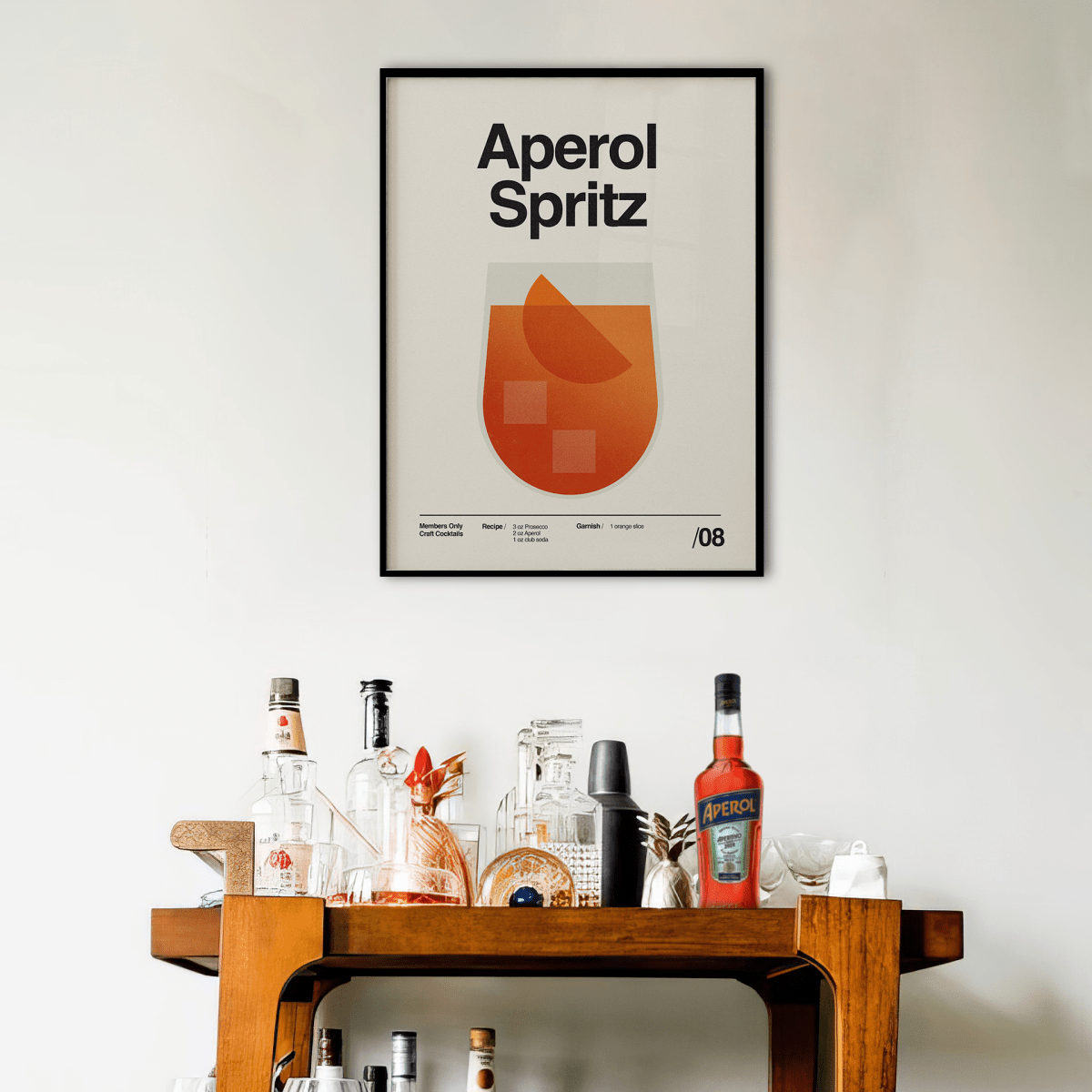 Elevate your bar or living room with this stunning Midcentury Modern art piece, printed on archival thick matte paper with premium inks. This elegant print not only enhances your decor but also serves as a charming invitation and recipe reference for enjoying your favorite cocktail, inspired by a stay at a White Lotus. Perfect for Nordic and Scandinavian styles, it includes a detailed recipe for the perfect Aperol Spritz.