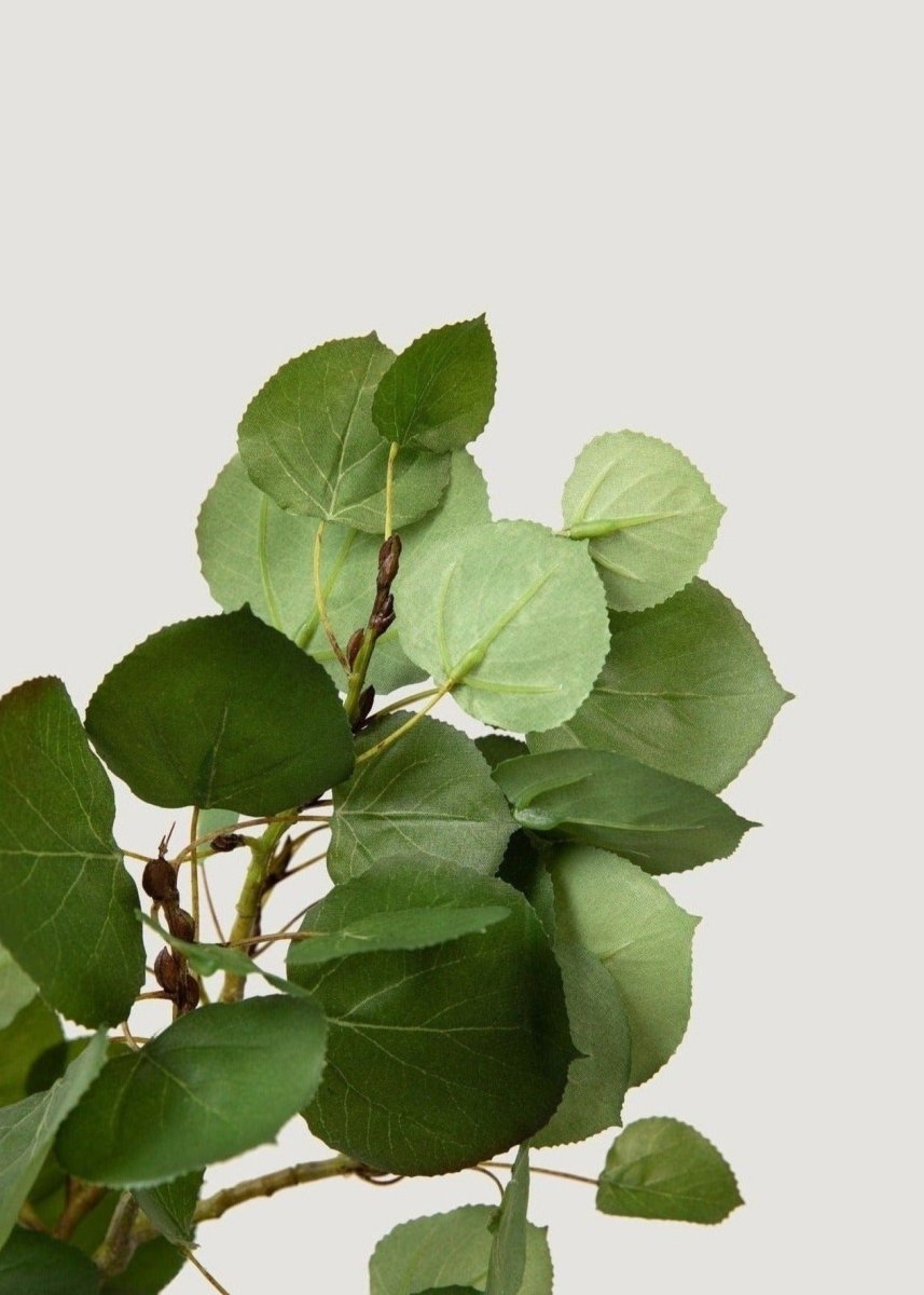 Each leaf measures 1-2.25" long by 1.25-2.5" wide, creating authentic proportions that mirror natural aspen leaves. The foliage portion spans 28" tall by 20" wide, providing substantial visual impact while maintaining natural branching patterns. The hand-wrapped stem technique ensures a realistic appearance from base to tip.