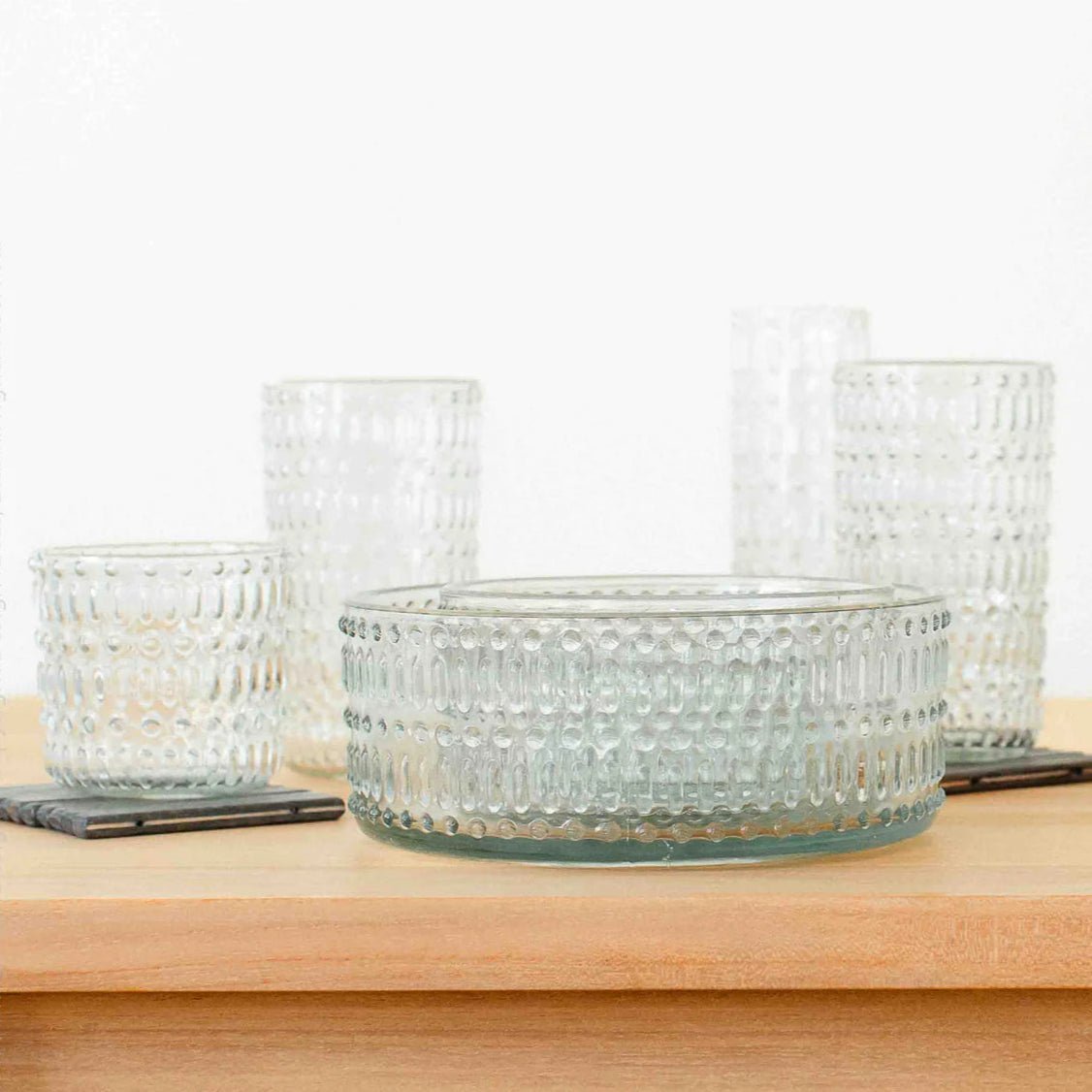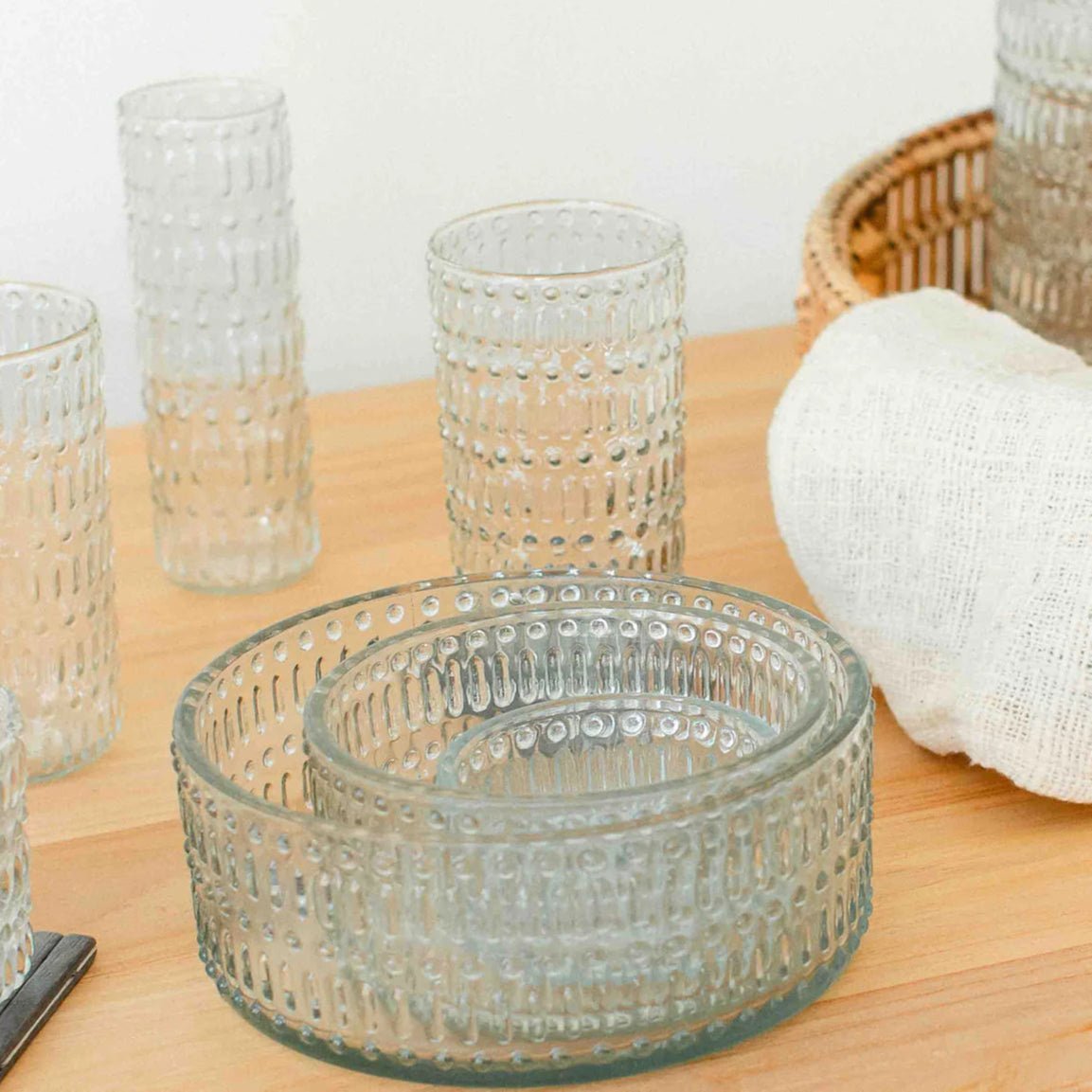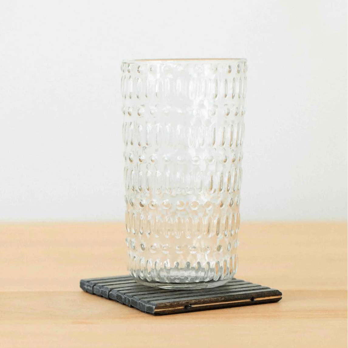 The Morse™ Highball Glass Tumbler combines distinctive dot-and-dash pattern design with practical everyday functionality. This 18.1oz glass tumbler takes its name from Morse Code, the original digital communication method, reflected in its unique surface pattern that adds visual interest to any table setting.