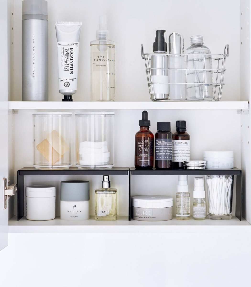 Are your moisturizers, serums, and face creams getting out of hand in the medicine cabinet? Double storage capacity with these sleek cabinet risers by tapping into unused vertical space, and enjoy your skincare and other grooming routines in a spa-worthy, graceful manner!