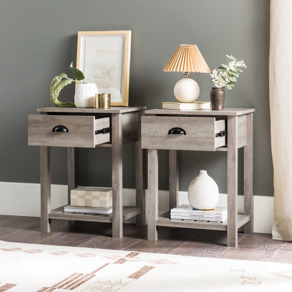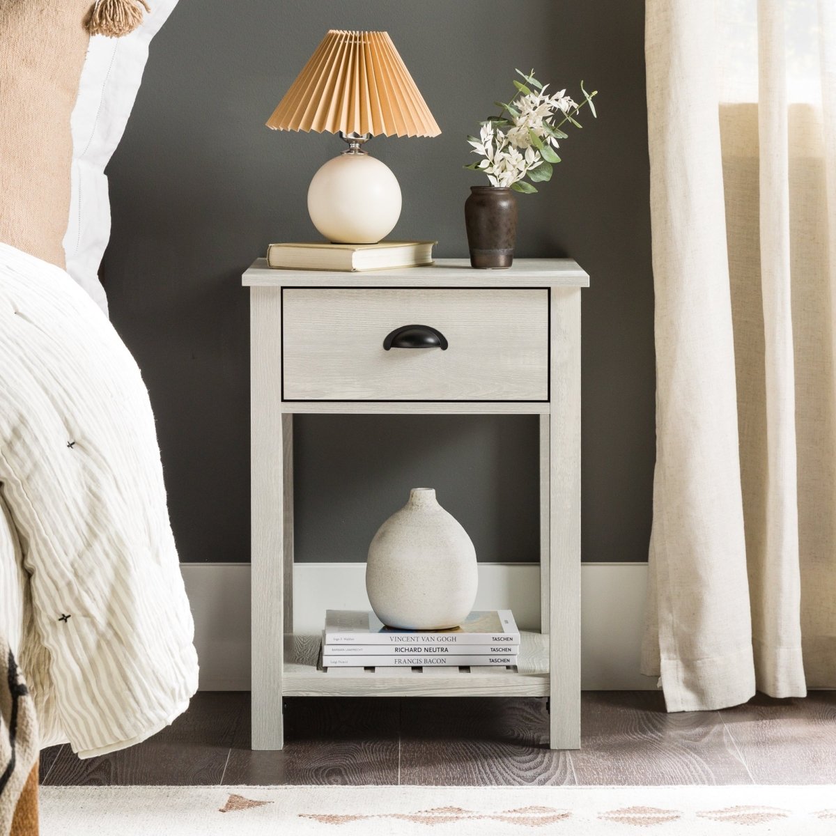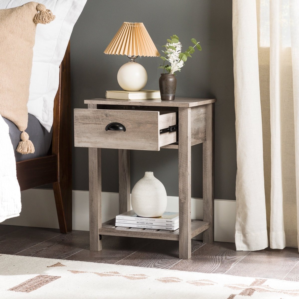 Regular price $43.00Whether you’re looking to keep things quaint and country or simply organize your home, this one-drawer farmhouse nightstand will satisfy your design desires. The single top drawer with a cup handle features telescoping metal drawer glides for a smooth push and pull track for convenient closed storage. The lower slat style shelf creates open storage while infusing farmhouse style. Use this accent table in the living room or home office for some sneaky storage. Pair with the matching entry table to make a complete set in your home.