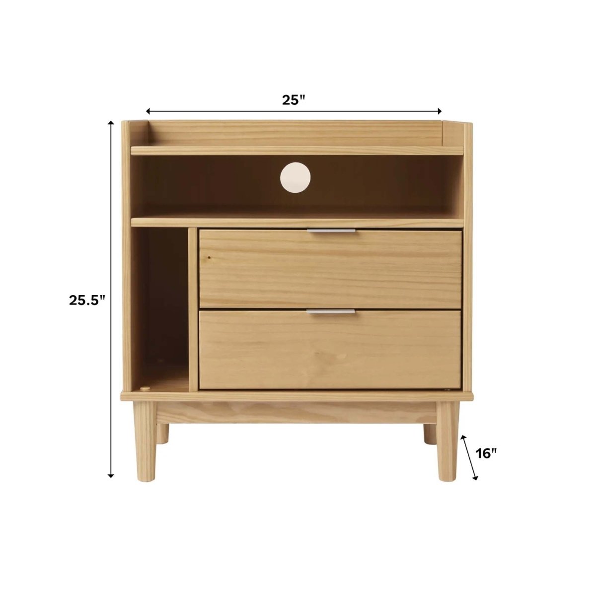The tray-style gallery top keeps your essentials secure, while the tapered round legs and sleek metal handles capture the iconic charm of mid-century modern design. Perfect for storing nighttime necessities, the spacious drawer and open shelf offer practical storage with a minimalist look.