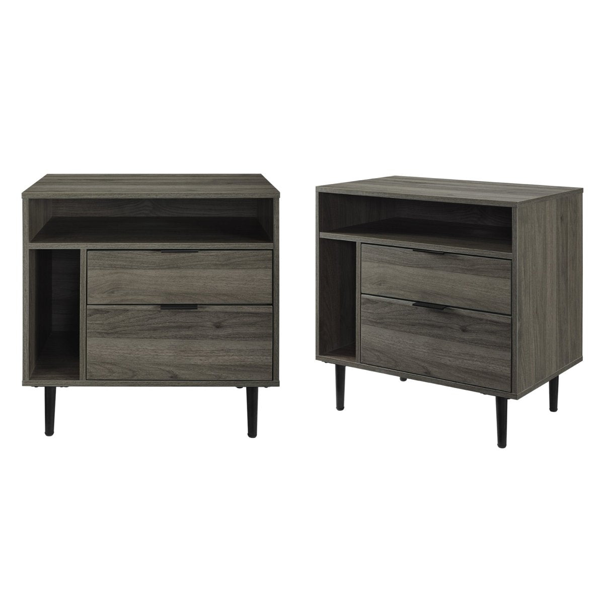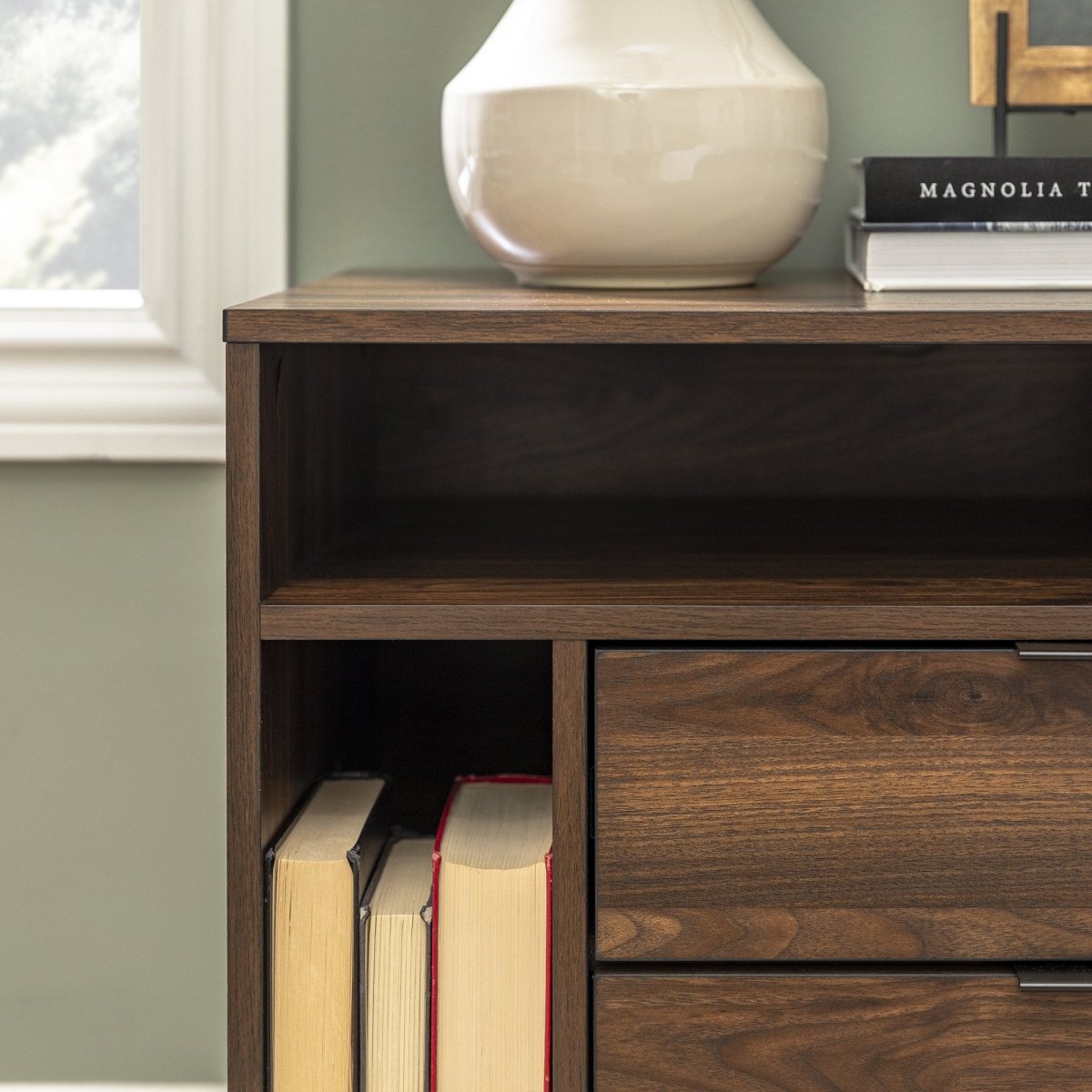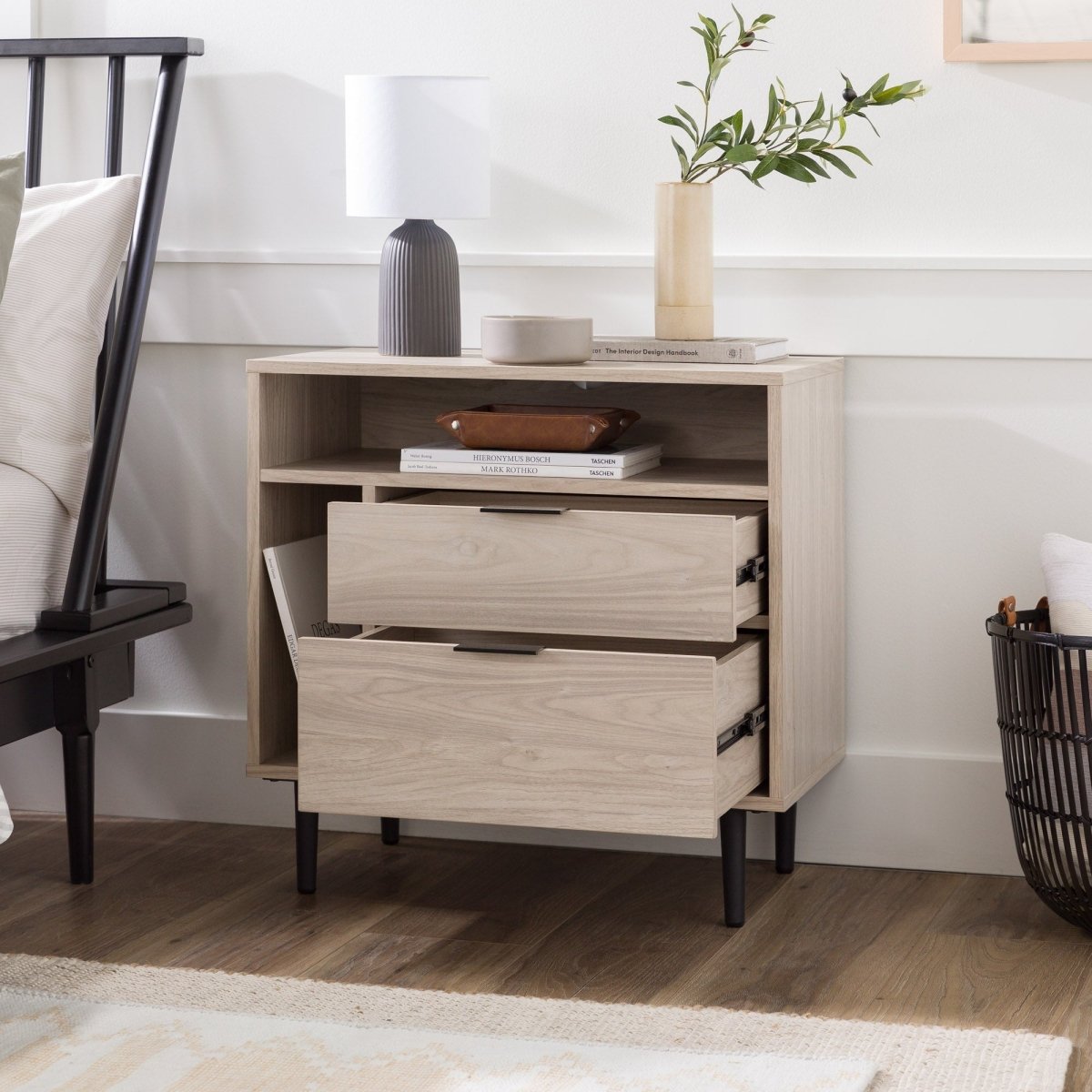 Regular price $67.00With storage to spare, this modern side table will become your go-to cabinet for everything. It has a contemporary combination of open and closed storage with two cubbies and two drawers. Each drawer features telescoping metal glides for smooth use. Slick metal legs feature adjustable rubber feet so you can set this end table on your floors without worrying about ruining them. This accent table also functions wonderfully as a mid-century inspired table since it has cord management options great for charging your electronic devices.