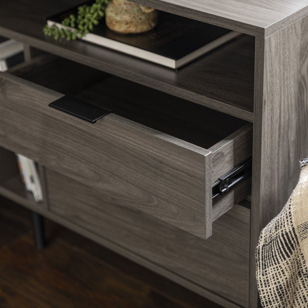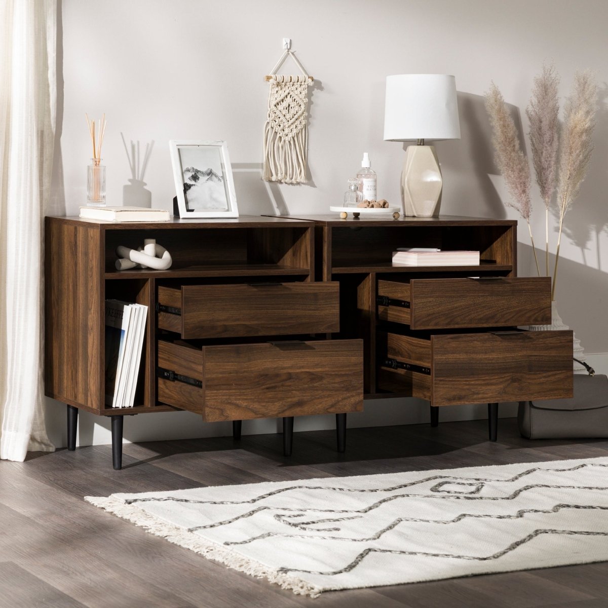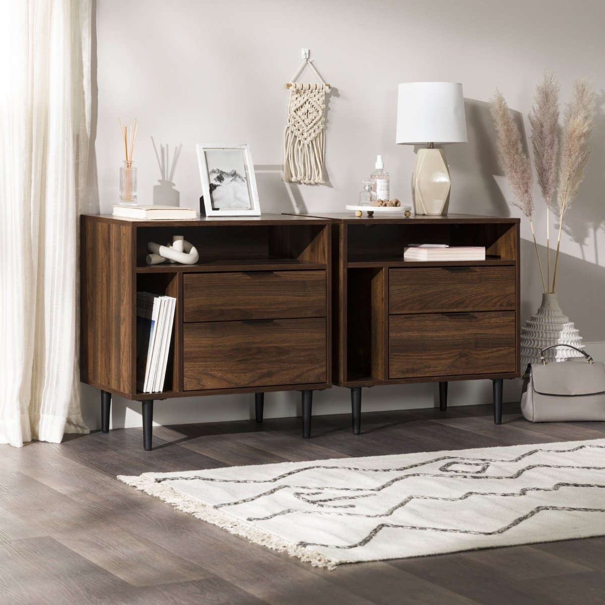 Regular price $67.00With storage to spare, this modern side table will become your go-to cabinet for everything. It has a contemporary combination of open and closed storage with two cubbies and two drawers. Each drawer features telescoping metal glides for smooth use. Slick metal legs feature adjustable rubber feet so you can set this end table on your floors without worrying about ruining them. This accent table also functions wonderfully as a mid-century inspired table since it has cord management options great for charging your electronic devices.