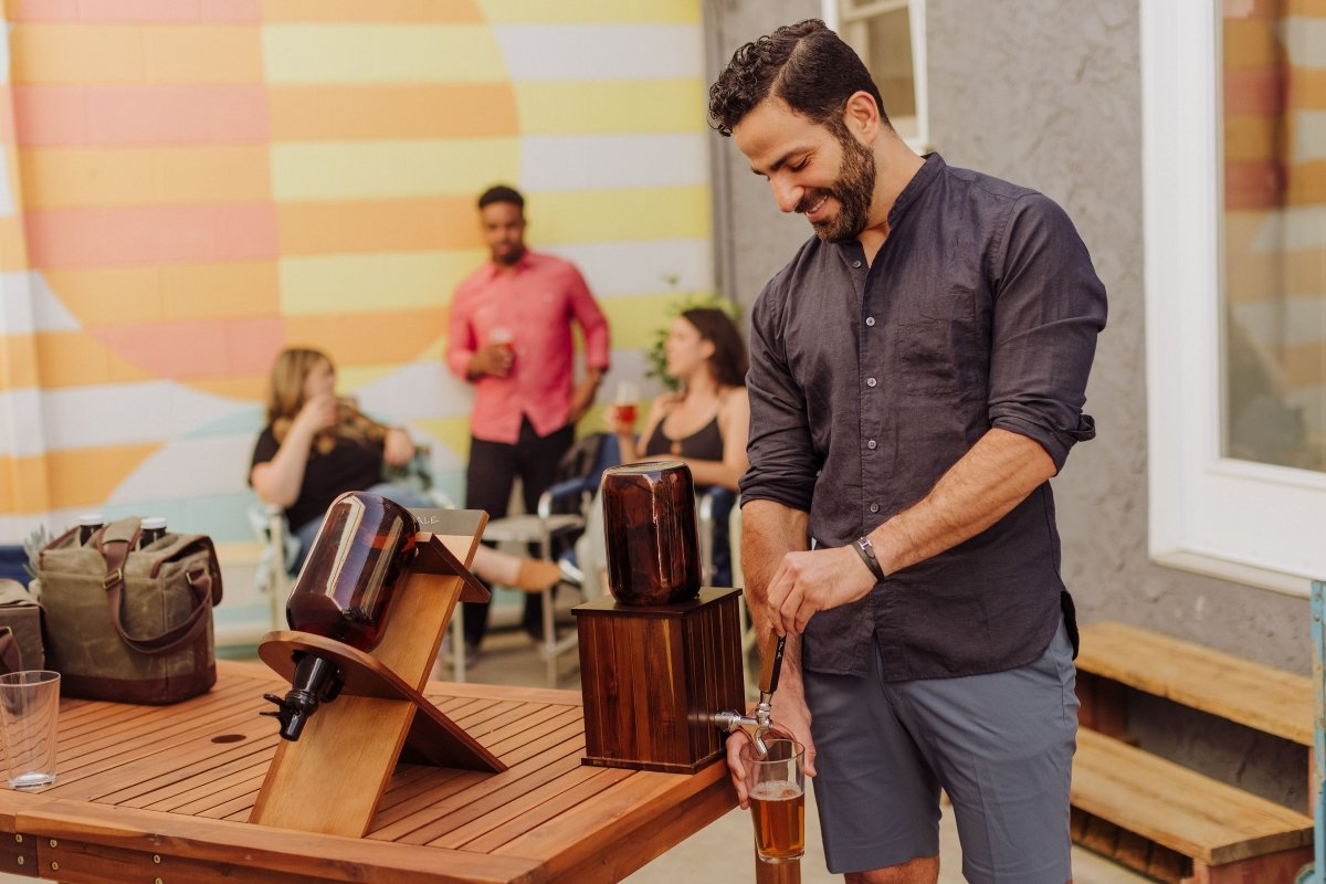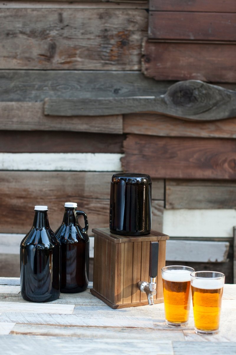 Regular price $179.95What's better than a freshly filled growler with your favorite brew? Your own personal Growler Tap to perfectly pour glass after glass, that's what. This innovative growler stand dispenses your beverage of choice from a 64-oz. growler (included) made of acacia and amber glass, and features a beer tap with removable handle and chalkboard surface to label your growlers brew. Now that sounds like the makings of a party! Made of acacia and amber glass.