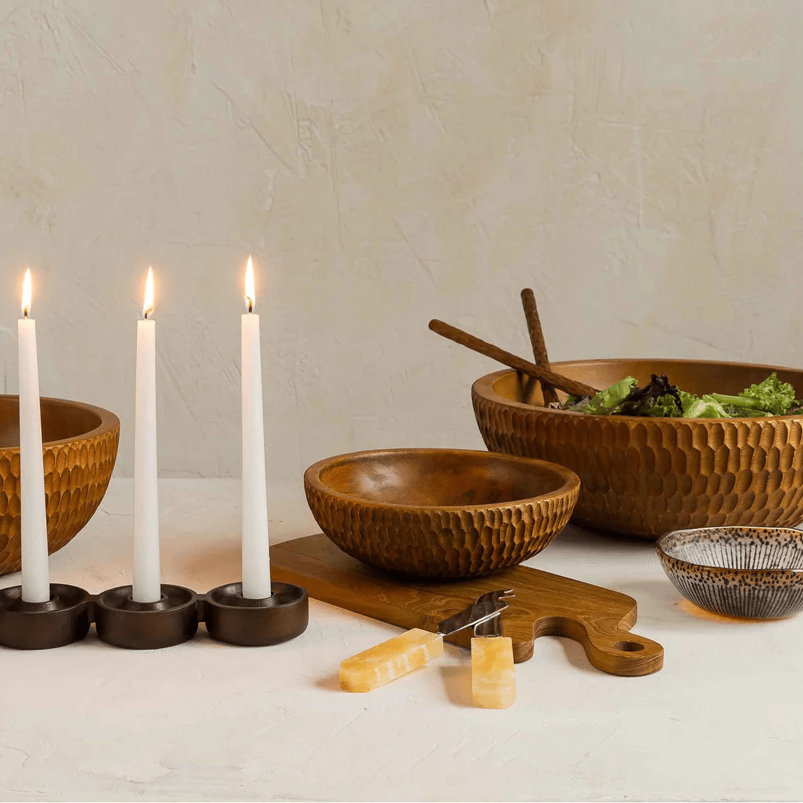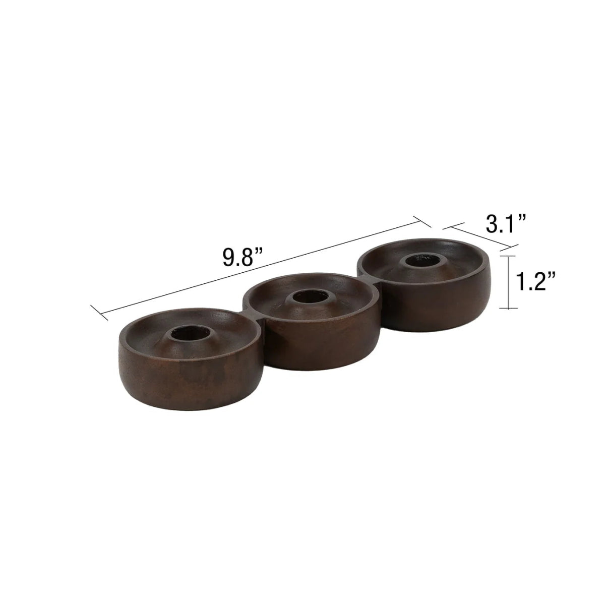 The Serra™ trio taper holder is meticulously crafted by hand from natural mango wood and adorned with a rich walnut finish. This candle holder holds up to 3 standard-sized taper candles. This decorative piece will provide comforting warmth to your home.