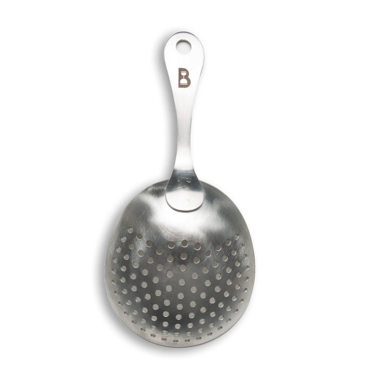 This julep strainer works seamlessly with Bull In China's Flagship mixing glass and fits most standard mixing glass sizes. The perforated bowl design allows liquid to flow through while catching ice and other solids, giving you clean pours every time.