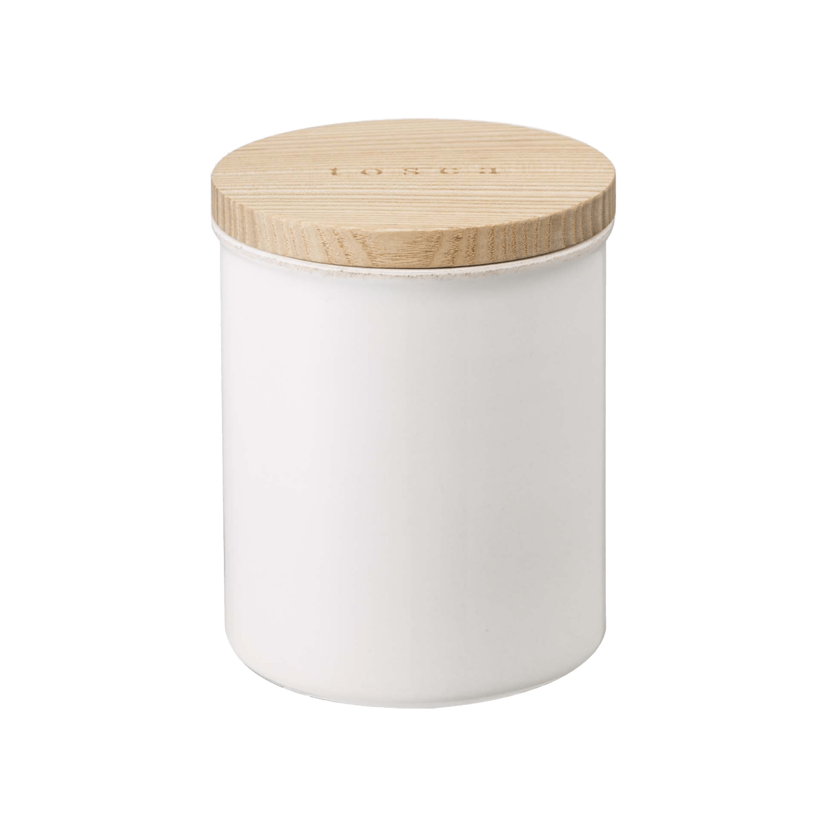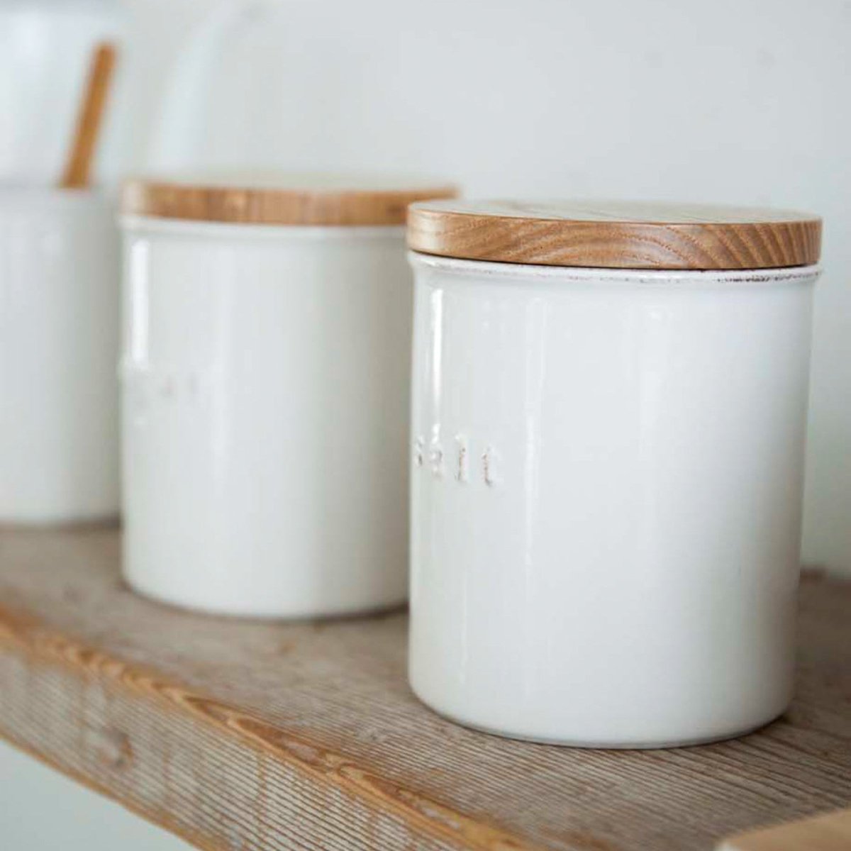 A simple ceramic storage canister for your pantry or countertop. The wide opening and wooden lid provide easy access to dry goods inside. Each lid is lined with a silicone gasket, making the canisters airtight. A perfect solution for storing everything from coffee beans or tea to salt, sugar, and other everyday pantry items.