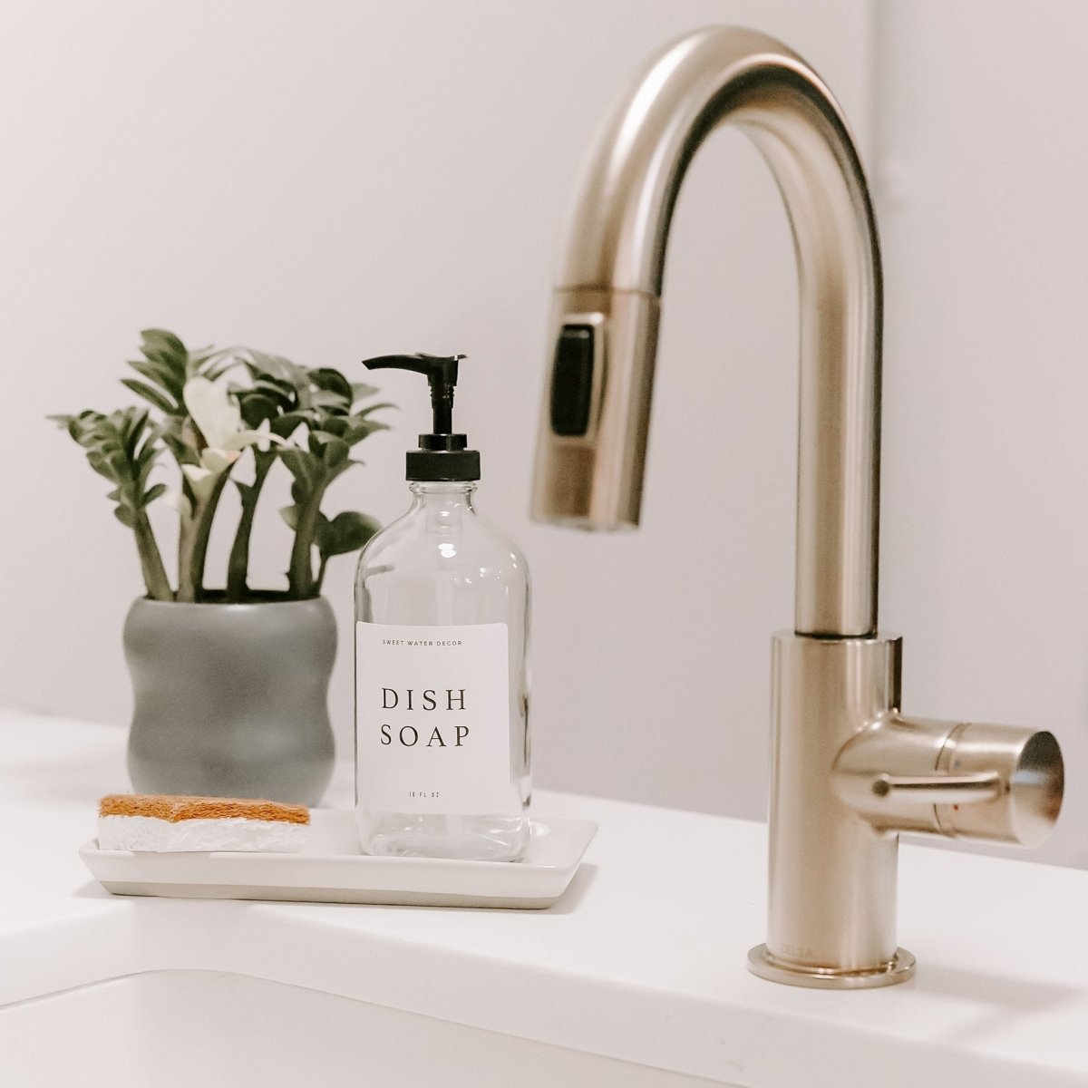 Sweet Water Decor Cream Stoneware Tray holding a dish sponge and dish soap pump bottle with a potted plant in the background.