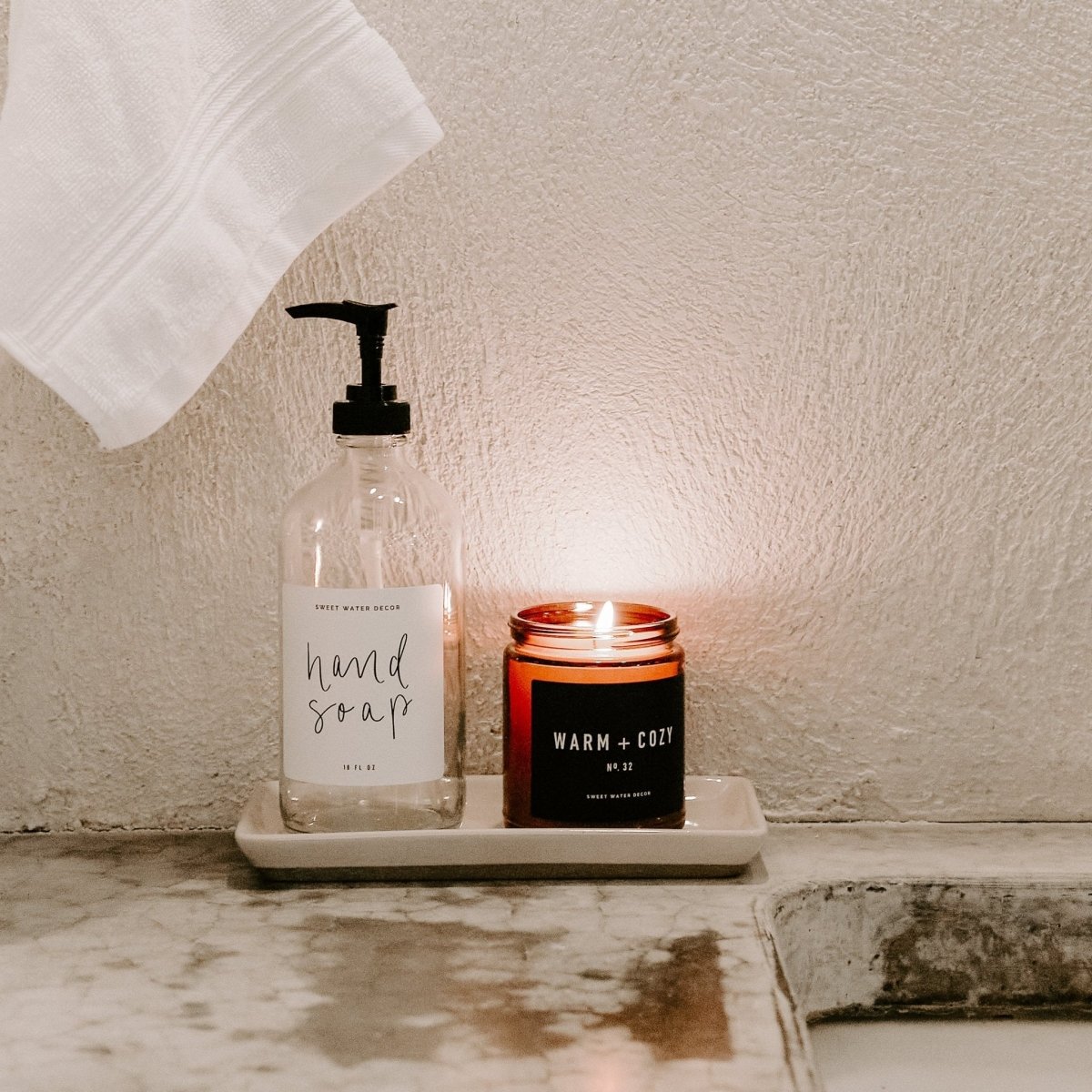 Sweet Water Decor Cream Stoneware Tray holding a hand soap pump bottle and lit candle in bathroom.