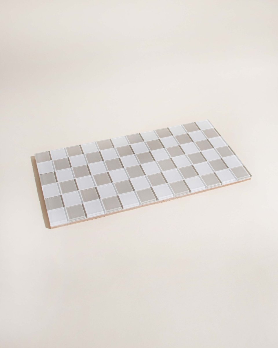 This handcrafted glass tile tray combines function with artisanal design. The rectangular tray features a beige and white checkered pattern, made from durable, heat-resistant glass tiles suitable for everyday use and special occasions.