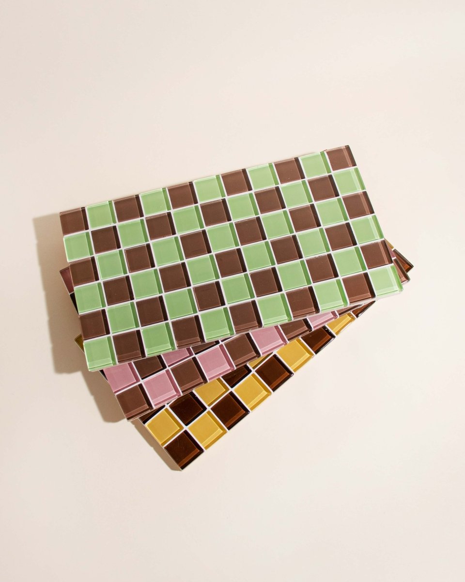 Each tray is individually crafted in small batches using durable glass tiles. The heat-resistant material makes it suitable for holding hot drinks, candles, or everyday items without concern. The glass tile construction provides a smooth, easy-to-clean surface that maintains its appearance over time.