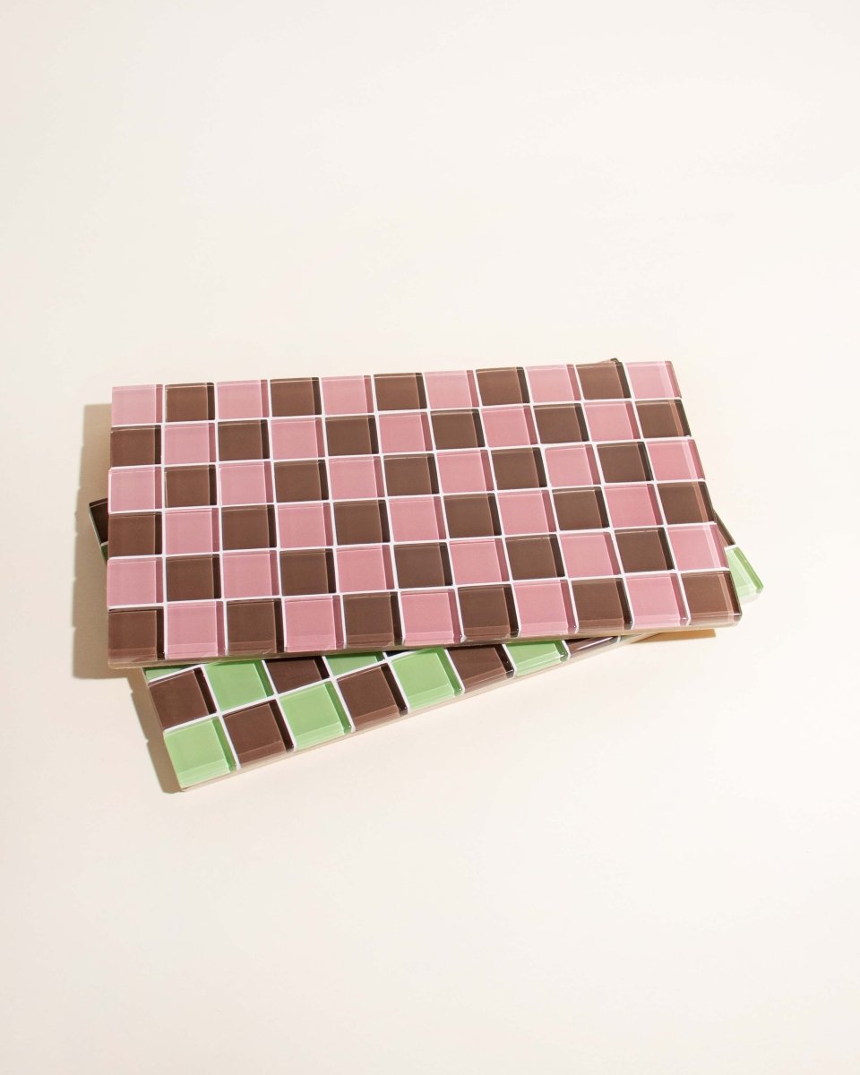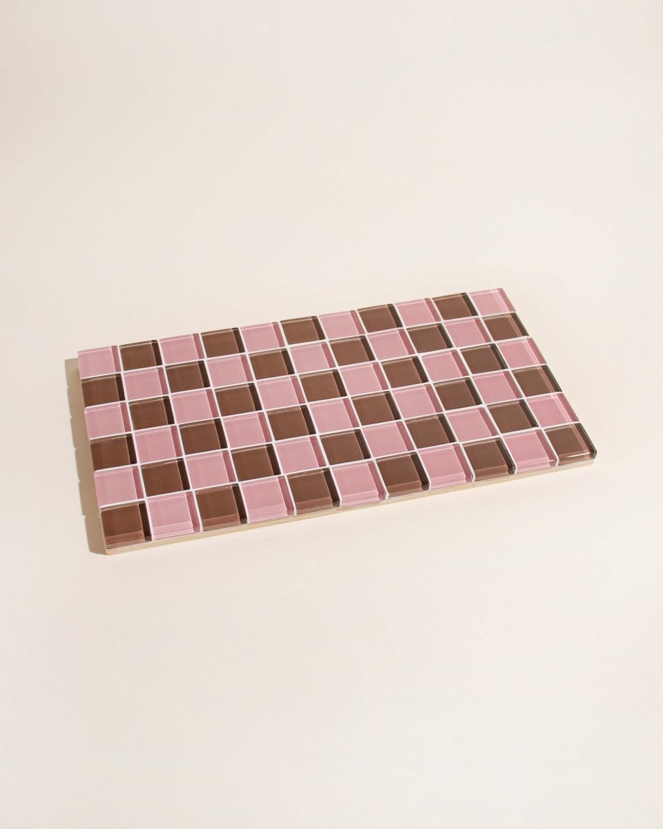 This handcrafted glass tile tray combines function with artisanal design. The rectangular shape features a striking combination of pink and brown hues, creating a unique decorative accent for any room. Made from durable, heat-resistant glass tiles, this tray serves multiple purposes—from organizing jewelry on your vanity to displaying candles on your coffee table.