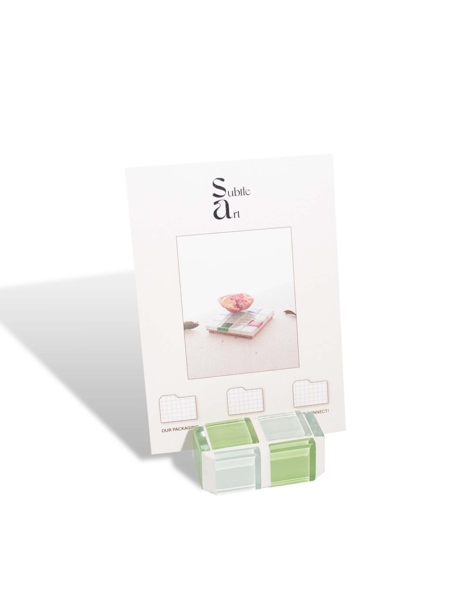 This mini glass tile picture stand combines high-quality glass tile with a natural wood base to create a functional display piece in pistachio green hues. The compact 2.5" L x 2.5" W x 1" H dimensions make it ideal for displaying photos, business cards, table numbers, small artwork, or place cards without taking up excessive space.