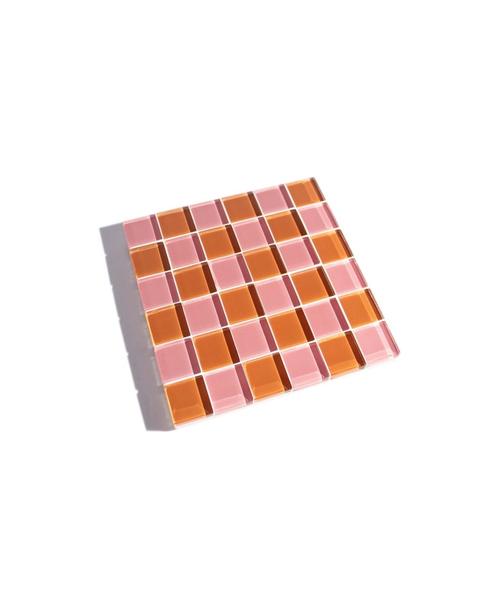 Each glass tile decorative tray is made by hand in small batches, ensuring attention to detail and quality craftsmanship. The individual glass tiles are assembled to create the pink and amber color pattern, with natural variations that confirm the handmade nature of each piece. This artisan approach means no two trays are exactly alike.