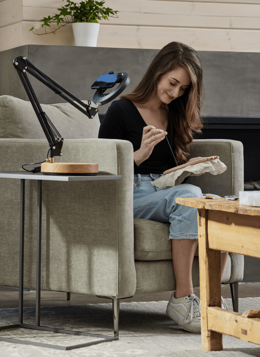 The Canvas Lamp with Weighted Wooden Base in black features a patented technology compatible with all smartphones. Its 6-axis positioning system enables effortless angle adjustment, while the innovative spinning camera plate allows for precise orientation. The built-in "bright and airy" ring light ensures consistent, perfect lighting, with dimmable features and three-color temperatures to match any environment.