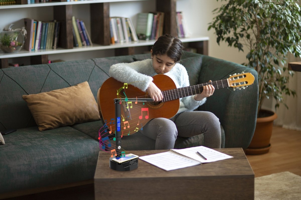 The digital calendar display shows date, time, and temperature at a glance. The display automatically syncs with the mobile app, keeping your schedule visible without manual updates. Monitor time and environmental conditions while working without checking your phone.