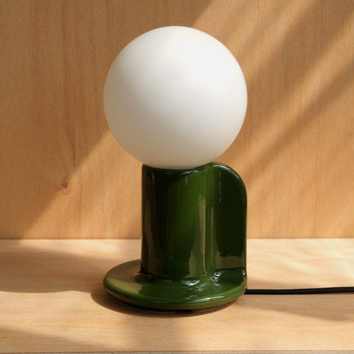 Each Q Lamp is handcrafted by Maker Goods in Milwaukee, featuring a glazed ceramic body with a distinctive paddle handle for easy repositioning. The UL listed lamp ensures safety standards while maintaining its artisan character. The included Tala bulb combines mouth blown glass with sand blasted finish, creating warm ambient lighting that complements the ceramic base.