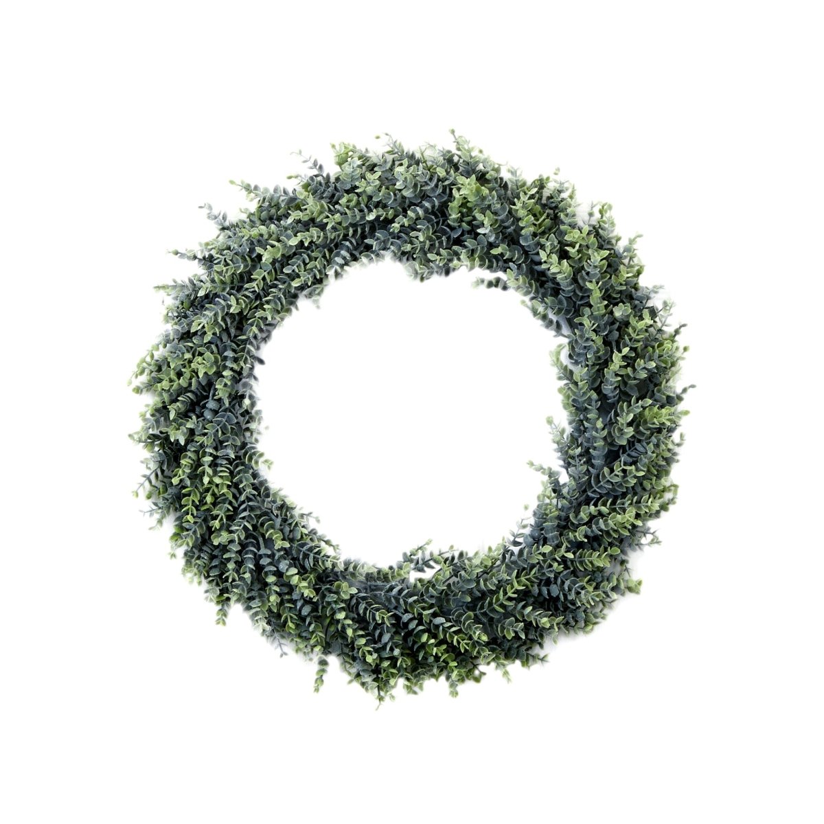 One 20-inch diameter artificial wreath with eucalyptus and boxwood foliage in mixed green tones. The wreath arrives ready to hang and can be shaped to your preference upon installation.