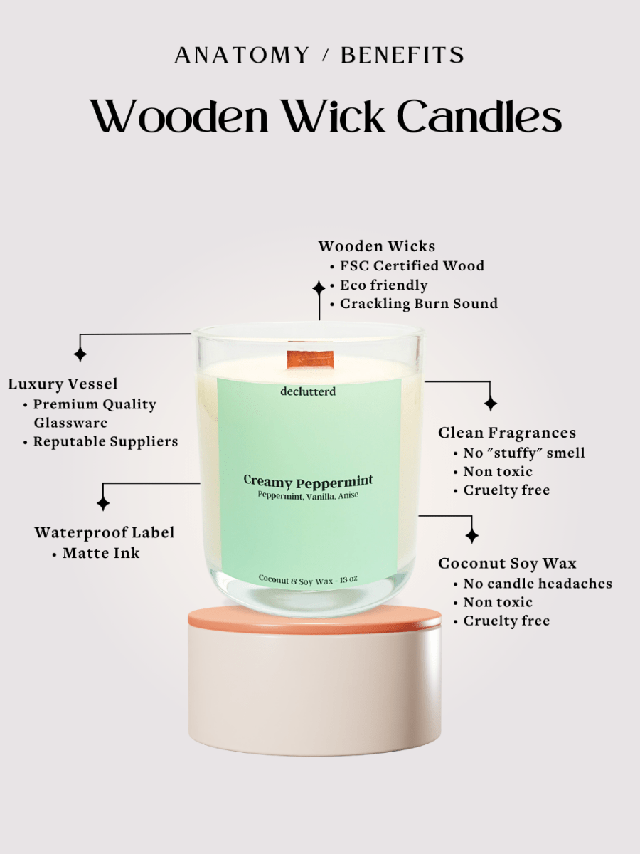 This peppermint wood wick candle combines crisp peppermint, warming anise, and comforting vanilla in a balanced blend. The coconut soy wax formula burns clean with minimal soot and no smoke, while the wooden wick creates a natural crackling sound that enhances the ambiance of any room.