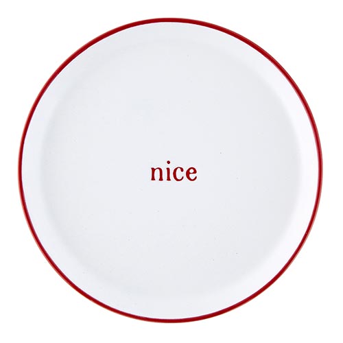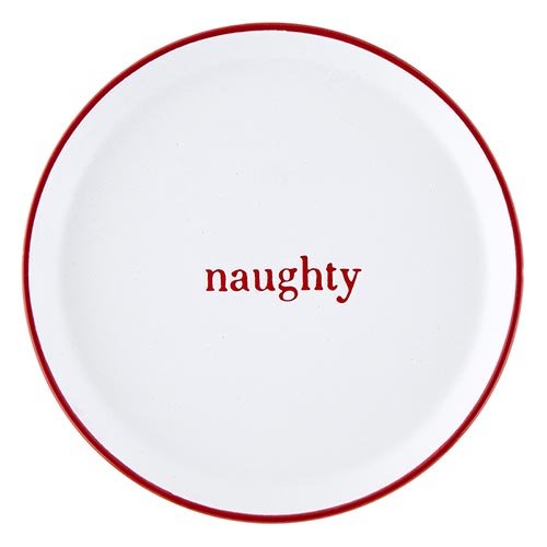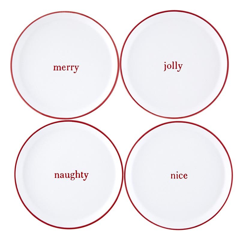 Each set includes two plates of each design, featuring the words "Merry", "Jolly", "Naughty" and "Nice" in red holiday styling. The variety of designs adds visual interest to your table setting while maintaining a cohesive holiday theme. Guests can choose their favorite phrase, making these plates a conversation starter at cocktail parties and holiday gatherings.