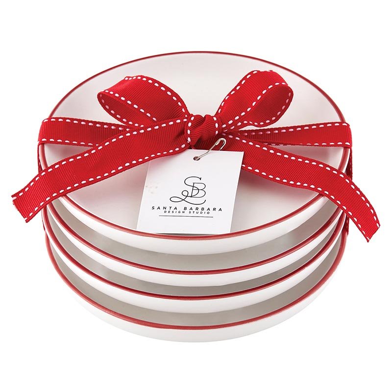 These festive appetizer plates bring holiday cheer to your Christmas entertaining. The set includes 8 stoneware plates featuring four assorted designs with seasonal messages that add a playful touch to your holiday gatherings.