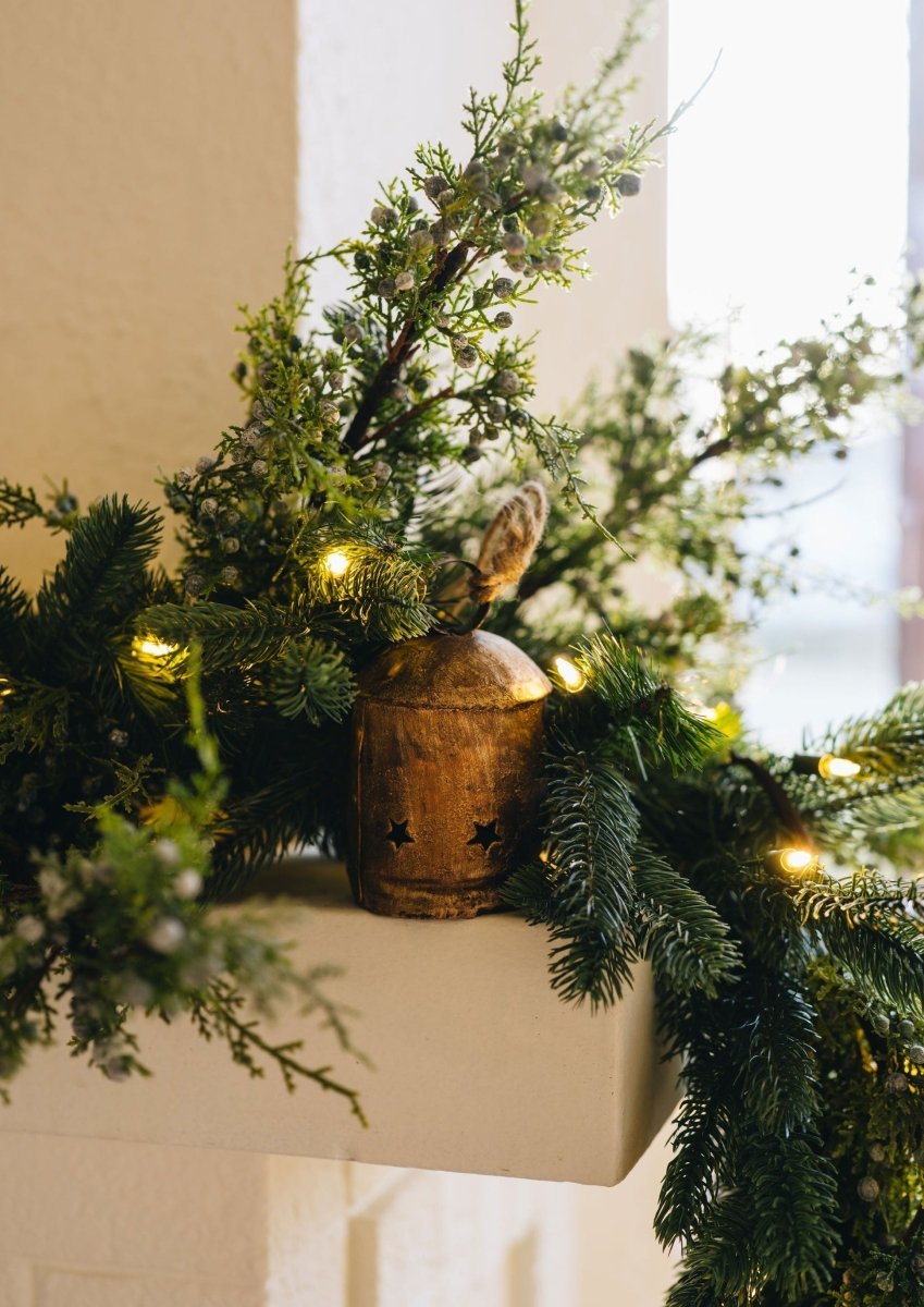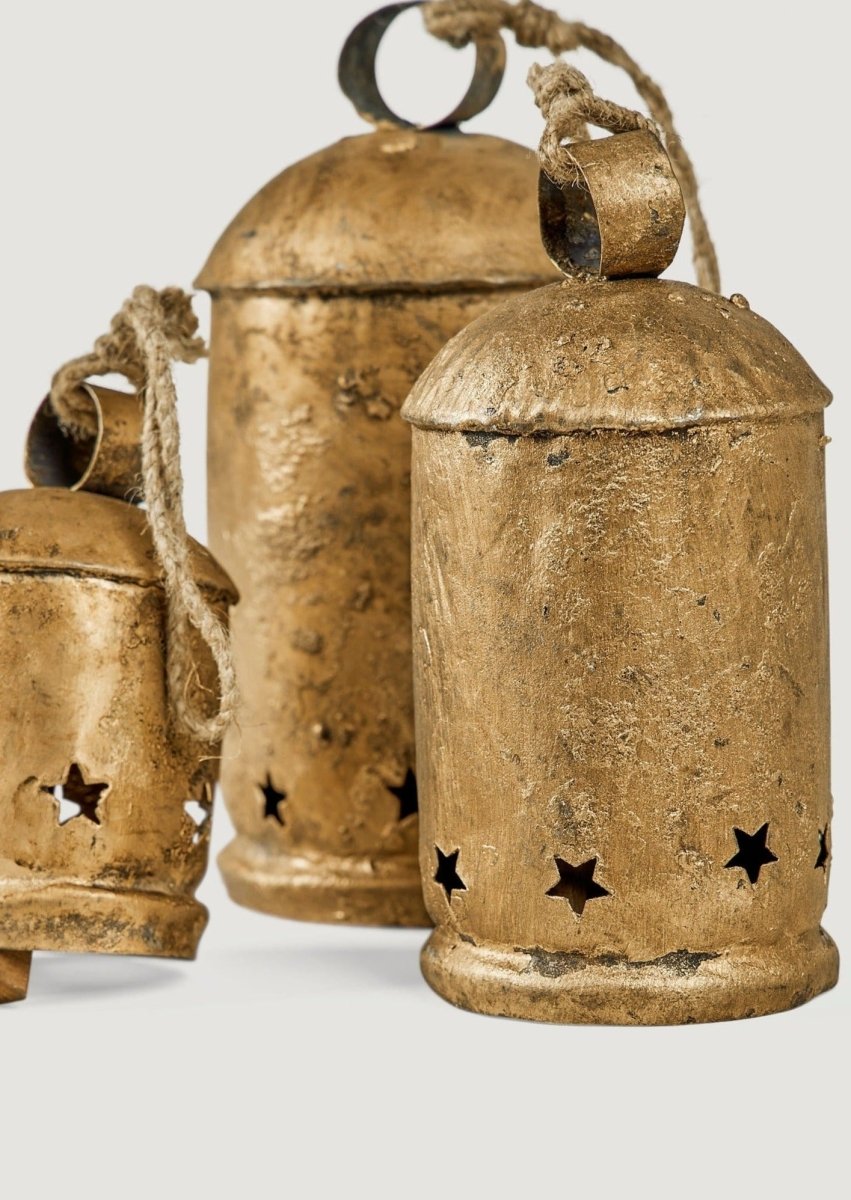 Crafted from 100% iron with an antique gold finish, these decorative bells bring authentic farmhouse character to your Christmas decorating. The distressed brass surface creates a vintage, aged appearance that complements rustic and traditional holiday themes. Star-shaped cutouts add visual interest and allow light to filter through when displayed near candles or string lights.