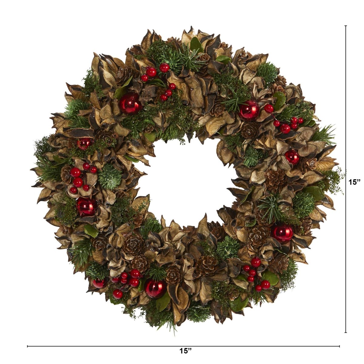 15" Christmas Wreath with Pine Cones & Ornaments - Mixed Greens