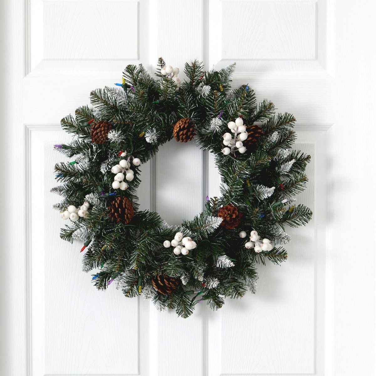 Light up your favorite seasonal accents while adding serious curb-side appeal with this artificial Christmas wreath intricately designed from realistic looking foliage in a palette of seasonal evergreens and accented throughout with faux pinecones that look incredibly realistic - all finished with a light dusting of fake snow. Arriving pre-strung with 50 multi-colored LED lights to effortlessly illuminate either a wall or door, this 24' (in circumference) decorative wreath makes for an inviting accent and will undoubtedly transform any entrance all throughout the holiday season.