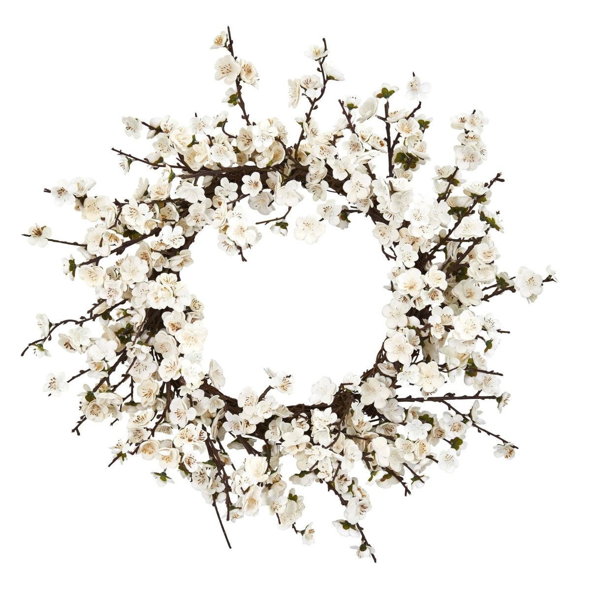 This 24-inch artificial plum blossom wreath brings the delicate beauty of spring blooms to your home year-round. Crafted with silk flowers, the white plum blossoms create a striking contrast against any backdrop, particularly stunning when displayed during winter months.