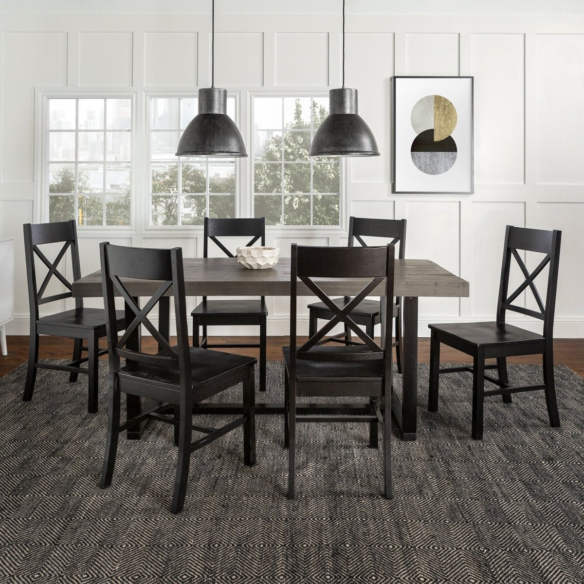 Complete your dining room or kitchen with this 7-piece farmhouse dining set. This table set features a distressed table top that is responsibly harvested for a sustainable addition to the design. With x-back chairs and a table in a two-tone finish, this dining set has a rustic, modern farmhouse appeal made of warp-resistant MDF, solid pine wood, and wood veneer. Spend time with your family more often around the table for mealtime. This set includes dining table and six dining chairs.