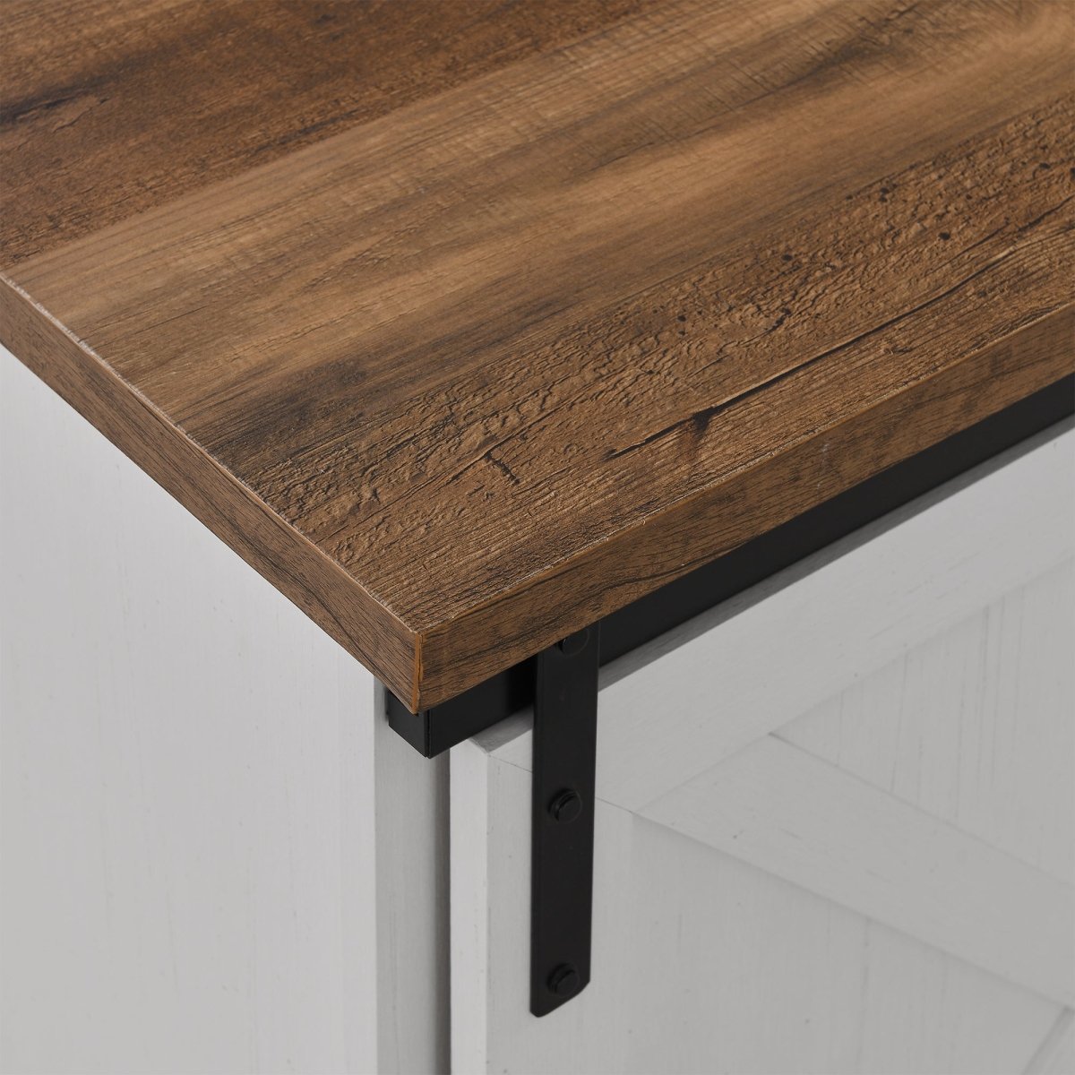 Slide open your new barn doors and showcase your best media components with this charming farmhouse TV stand. This rustic console hosts three adjustable shelves, perfect to for holding all your favorite video games, movies, or home décor. Its two-tone look offers a chic, country pop to any room. Smooth, powder-coated steel allows a seamless glide to the darling barn door design. Dress it up for a classy chateau atmosphere or keep it simple to emulate a pastoral cottage aura. And with cord management ports for your electronic cables, the media stand stays oh-so tidy. Use this versatile piece in your living room, dorm, bedroom, or home office.