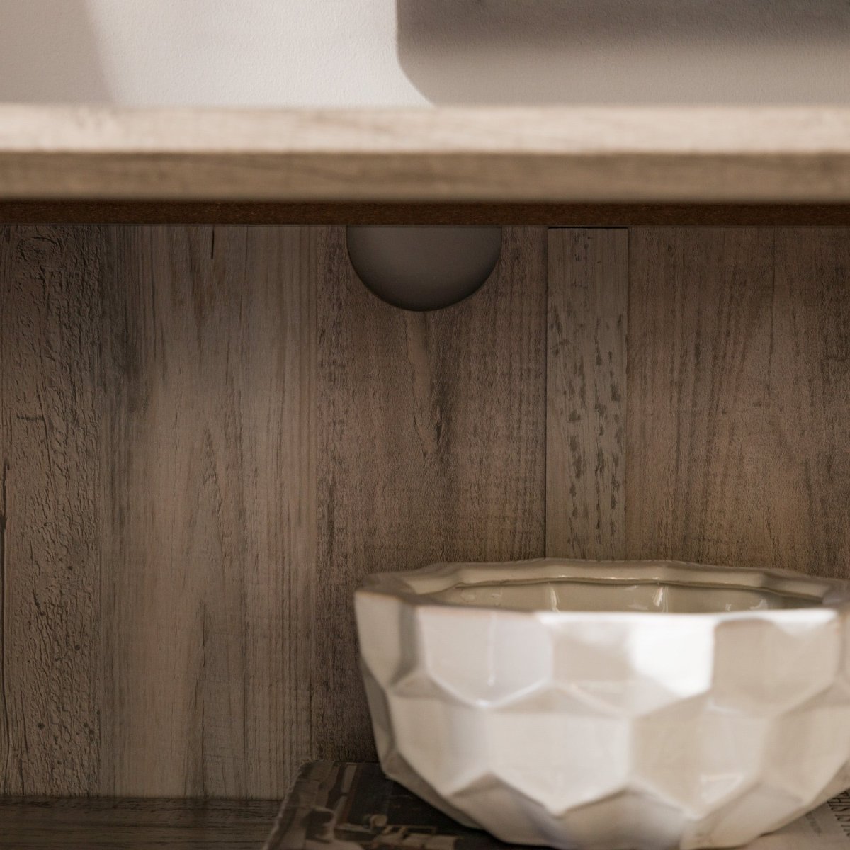 Regular price $98.00Country flair for the current age, this farmhouse TV stand has a historic presence mixed with all the modern modifications necessary to make this a dream entertainment stand. It has adjustable shelves and cord management options so you can organize electronics to your preference. Four tempered glass doors with a classic fretwork design feature metal corner accents that incorporate a rustic element to into this traditional console. The doors also have soft-close hinges. A beveled top and bottom add the final touches to this charming country style media stand.