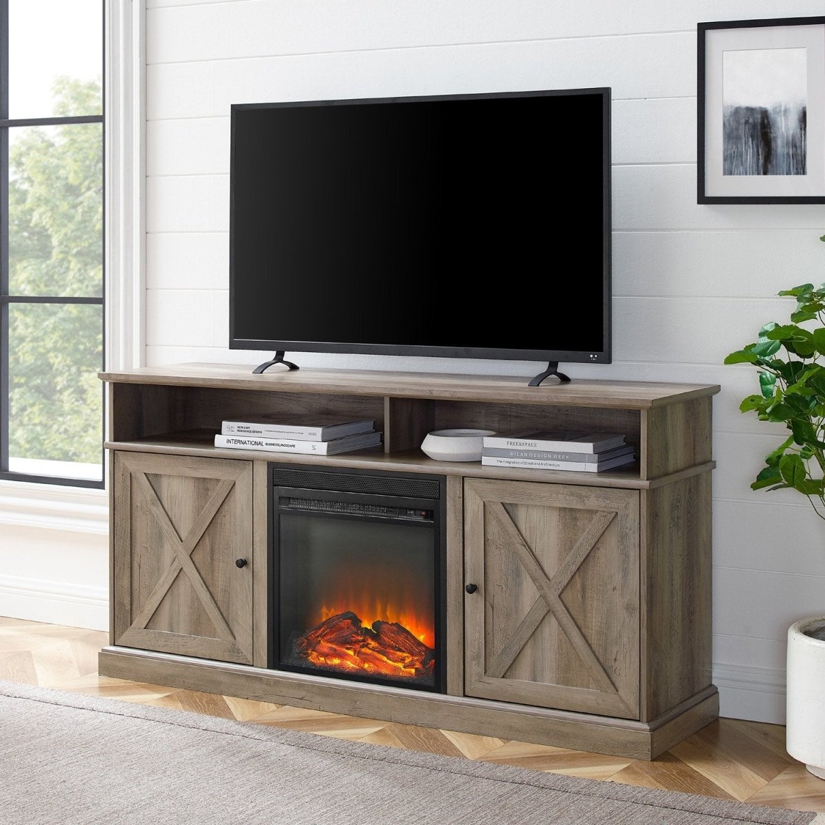 Regular price $155.00Warm your feet by a cozy electric fireplace with this modern 60” highboy TV console. No matter the time of year, there’s always time for a bit of comfy self-care. Pop on your favorite movie as you organize your favorite home décor items on your new media stand. Use the cord management to keep it looking tidy and organize your favorite electronic components behind the X-front cabinet doors. Let its modern farmhouse aura warm your home as you sip hot cocoa or swirl a glass of wine. Try this barn door fireplace tv stand in the living room, home office, or anywhere else you want a touch of comfort.