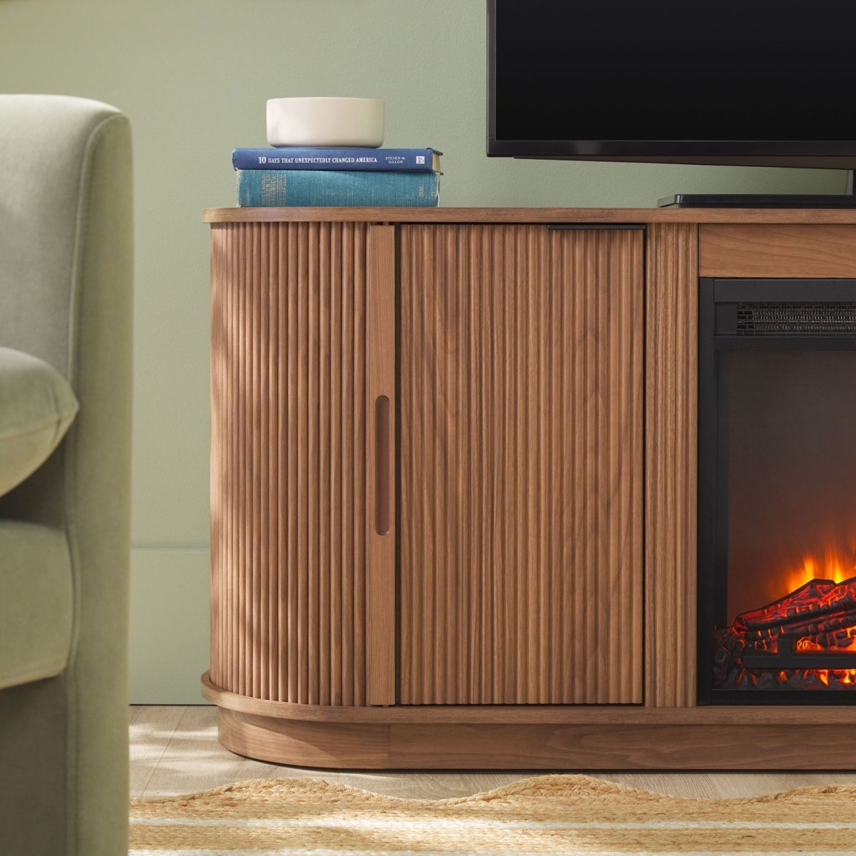 Regular price $450.00This 60-inch fireplace TV stand combines functional media storage with ambient heating in a clean, Scandinavian-inspired design. The reeded sliding wrap-around doors provide concealed storage for media devices, gaming consoles, and accessories while keeping cables organized and out of sight.