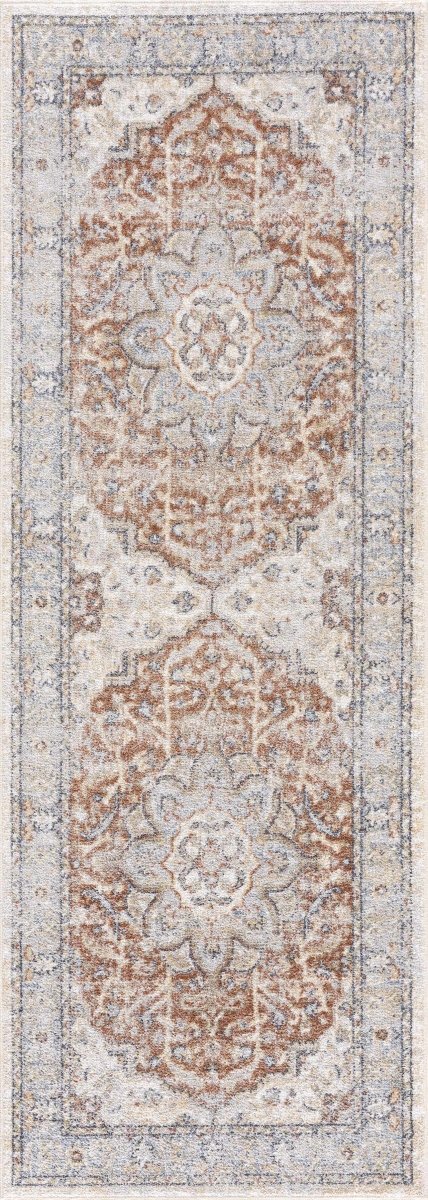 The cream base incorporates shades of beige, off white, and gray throughout the design. These neutral tones complement both warm and cool color schemes, making the rug versatile for living rooms, bedrooms, dining areas, and entryways. The multi-tonal pattern helps disguise minor dirt between cleanings.