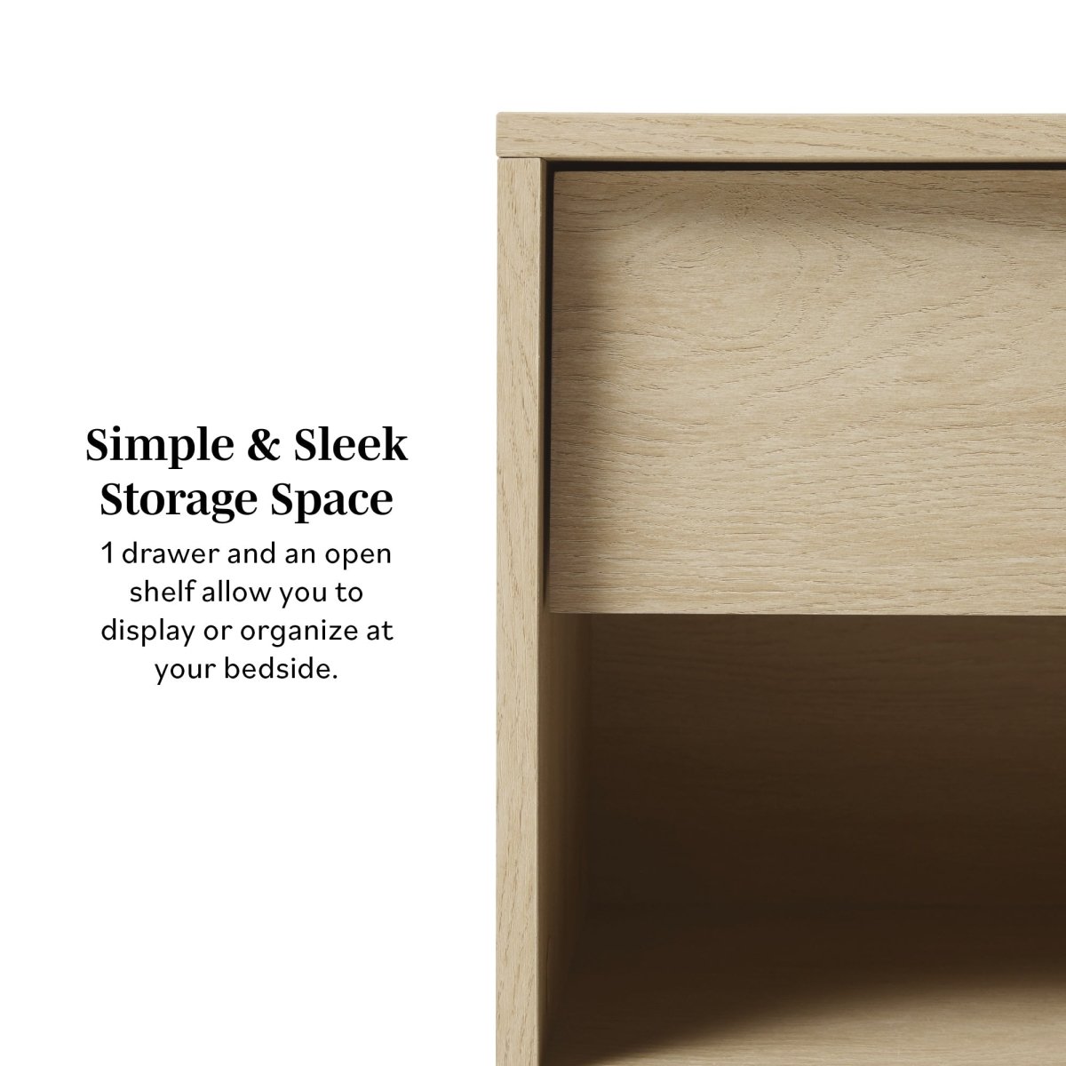 Regular price $39.00Simple yet ultra-sleek, this understated nightstand is as convenient as it is stylish. Whether it’s at your bedside or sitting by your couch, this side table is here to serve. Its single drawer on smooth glides slides out to store your skincare essentials or electronics, while the open cubby is there to help you display your favorite décor or current read. Minimalist hardware lends a modern feel to the mid-century silhouette of the piece. Perfect for your child’s room or your own sanctuary, this nightstand is just the piece you’ve been looking for.
