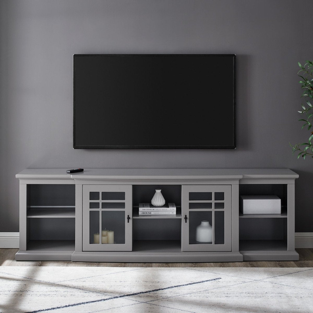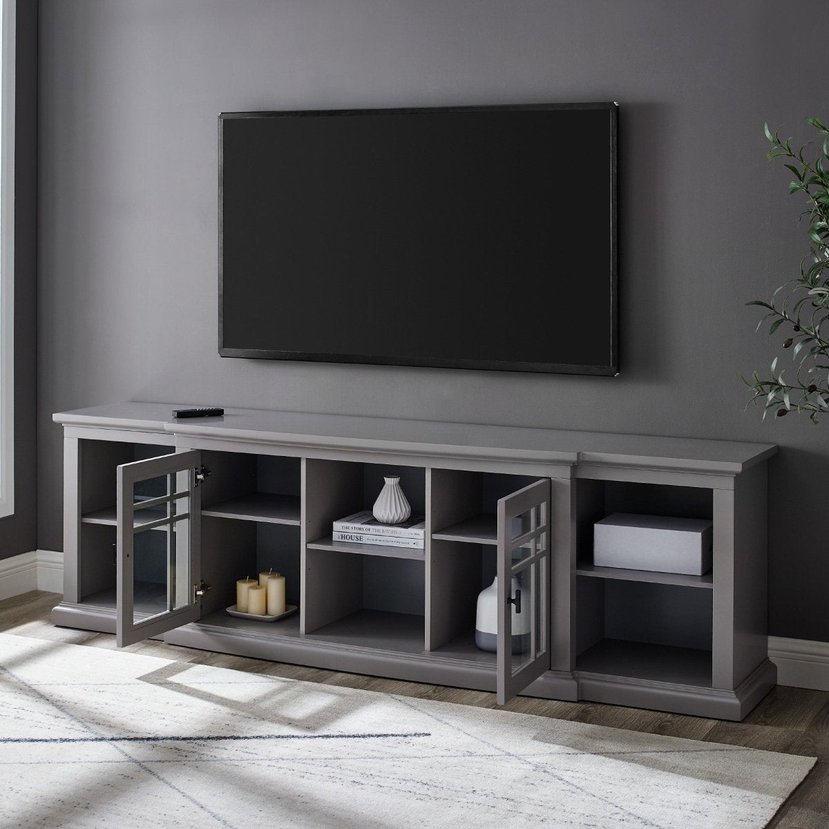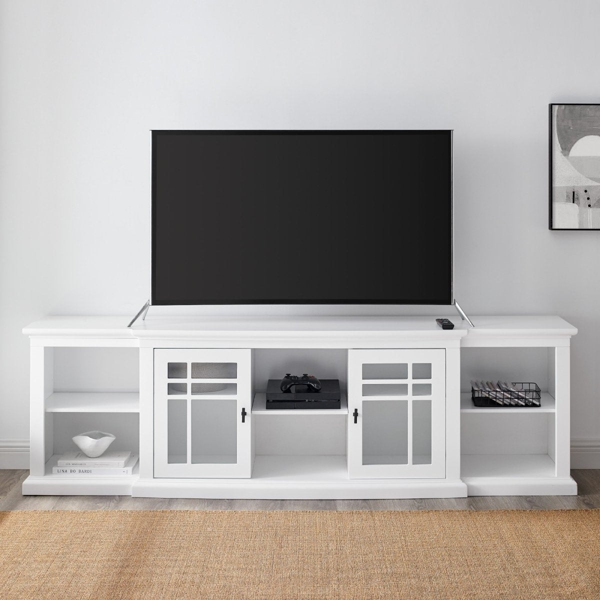 Keep your proclivity for the classics in mind and nestle this transitional TV stand in your favorite nook. Take advantage of the spacious tabletop and debut pottery pieces or houseplants. Five adjustable shelves and cord management ports make organization easy, with enough space for your media consoles, streaming devices, or collection of board games. Detailed, tempered safety glass doors add an element of modern intrigue to the piece’s classic frame and subtly showcases your décor. With just the right blend of open and closed storage, this console is sure to store anything and everything you need for epic movie marathons or watch parties.