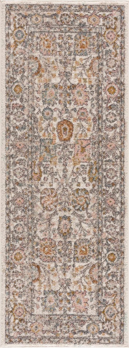 The multicolor design incorporates charcoal as a grounding neutral, complemented by warm tones of mustard and camel. Dusty pink adds subtle dimension, while light gray and off-white provide contrast. Sky blue accents complete the traditional color scheme, allowing this rug to coordinate with existing furniture and decor.