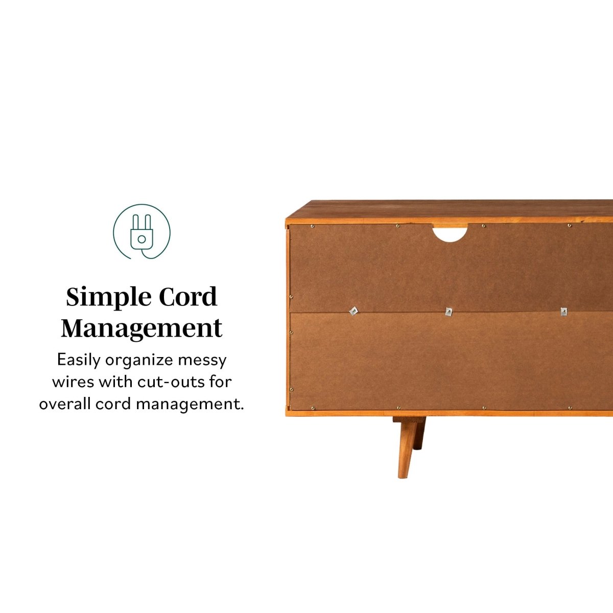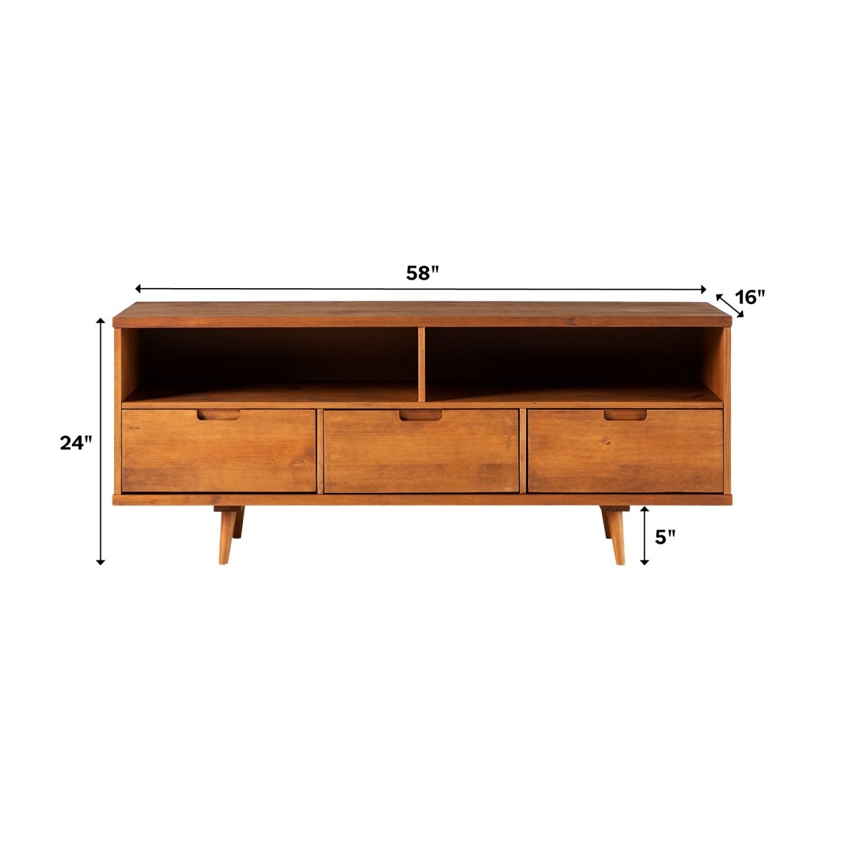 Regular price $330.00With slightly tapered legs, this 58-inch TV stand features a mid century modern silhouette to complement your home’s aesthetic. Crafted of solid pine wood to showcase a beautiful, natural grain stained finish for a warm texture to your living room. With three easy to access drawers featuring cutout handles, two open shelves above, and cord management to organize your electronics. This TV stand can also be incorporated in your bedroom as a storage cabinet or in your kitchen as a buffet due to its versatile design. Providing additional storage space in your home for the essentials you love most, from your favorite movies to your book collection and family photos. This entertainment center can fit up to a 64-inch TV.