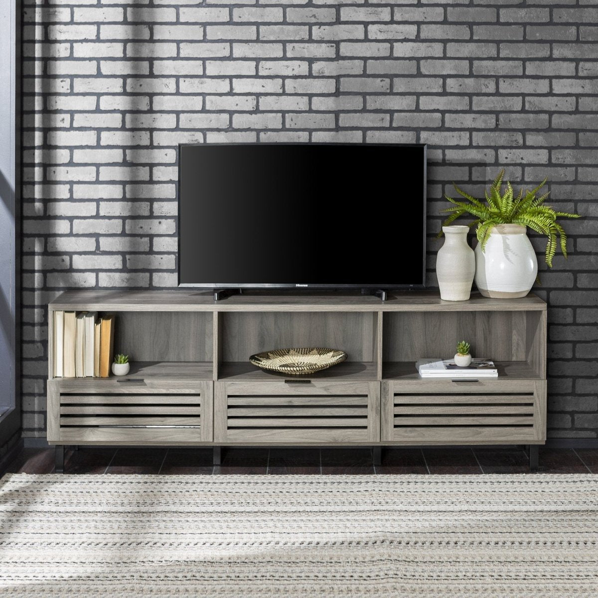 Featuring several alternatives for storing your media, this 70-inch slatted media console will keep your items organized in your home. The long frame fits three separate compartments on top and below, with the top three being open shelves and the bottom three being side cabinets and a middle drawer. Store anything from your electronics and media to your décor and books in this fabulous entertainment center.