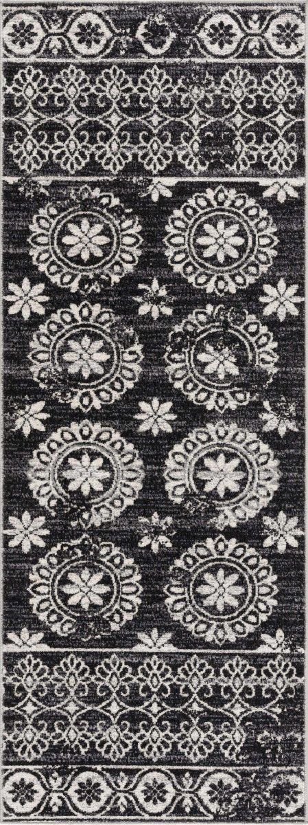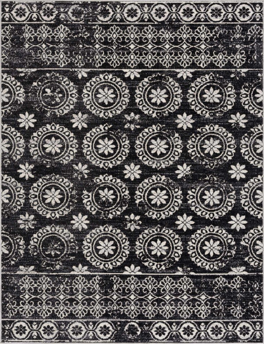 Regular price $73.00The Kahramankazan Washable Area Rug combines practical functionality with contemporary style. This machine-woven polyester rug features a modern floral pattern in black, gray, and light gray tones, making it suitable for various interior design schemes.