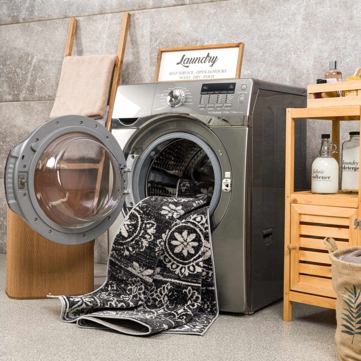 Polyester construction provides several advantages for area rugs. The synthetic fibers resist moisture, dry quickly after washing, and maintain their shape over time. The material's inherent stain resistance makes spot cleaning straightforward between machine washes.