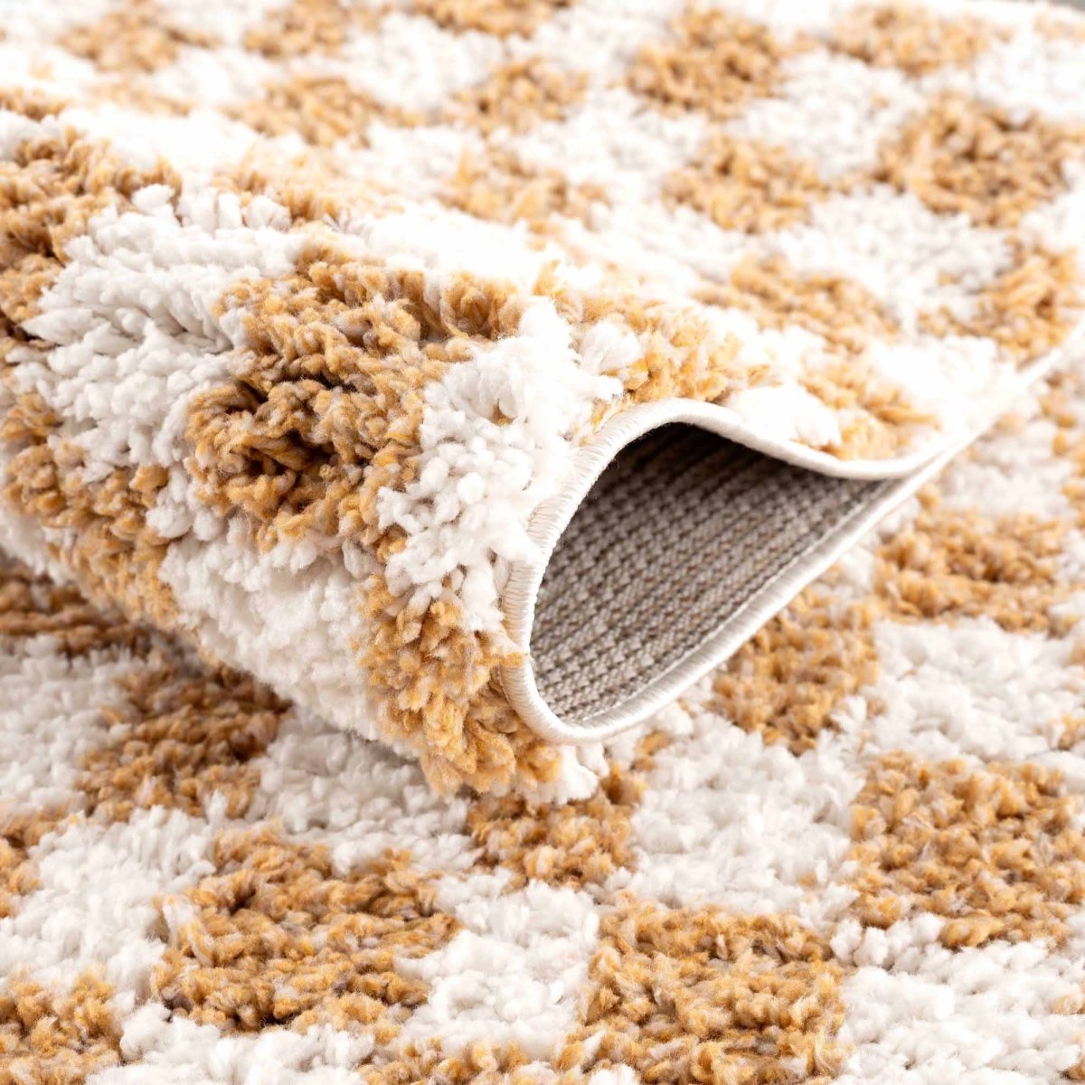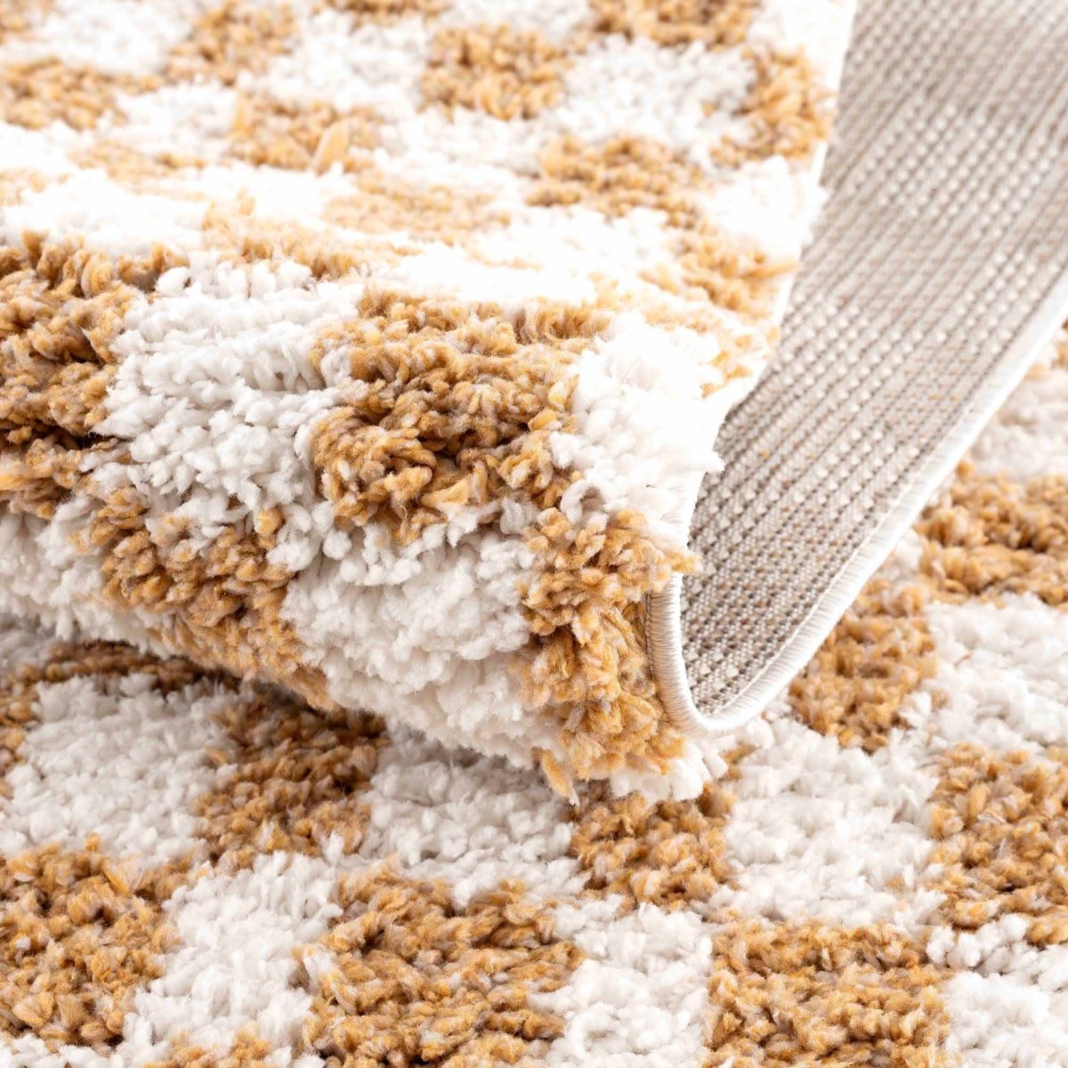 The yellow and white color palette offers versatility in styling. The yellow tones add warmth and energy, while the white provides balance and brightness. This combination works particularly well in spaces that need a cheerful lift or where natural light can enhance the colors. The plush pile texture adds dimension to the geometric checkered pattern, creating subtle shadows that enhance the visual interest.