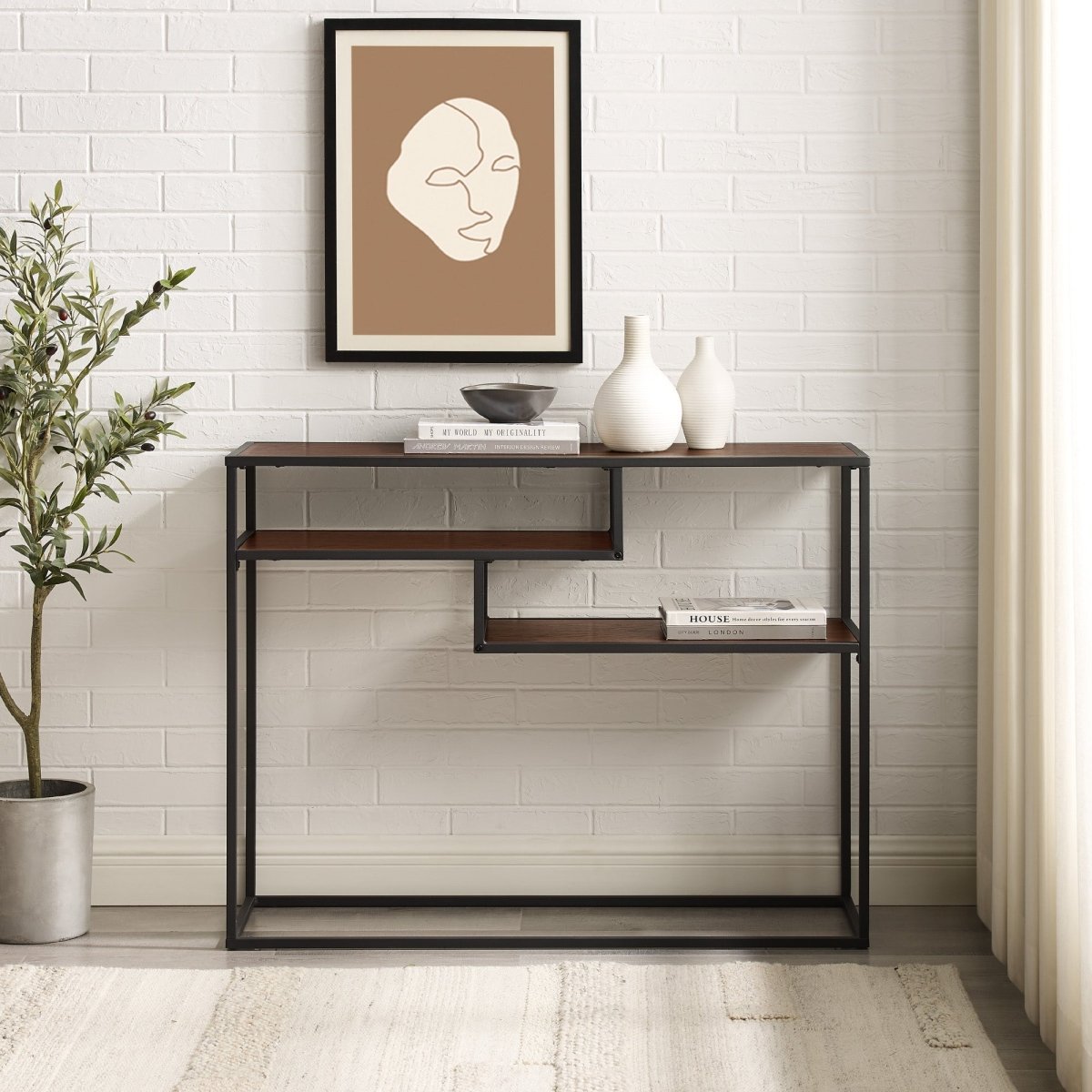 Give your hallway, entryway, or mudroom a quick and easy refresh with this contemporary console. Two floating shelves lend additional display space, while a spacious tabletop leaves room to host houseplants, candles, and décor. This entry table’s sleek design makes it the ideal couchside storage companion, as well as the perfect piece for your small space or apartment. With included wall-mounting hardware and a sturdy, powder-coated steel build, this piece is sure to debut your favorite décor for decades.