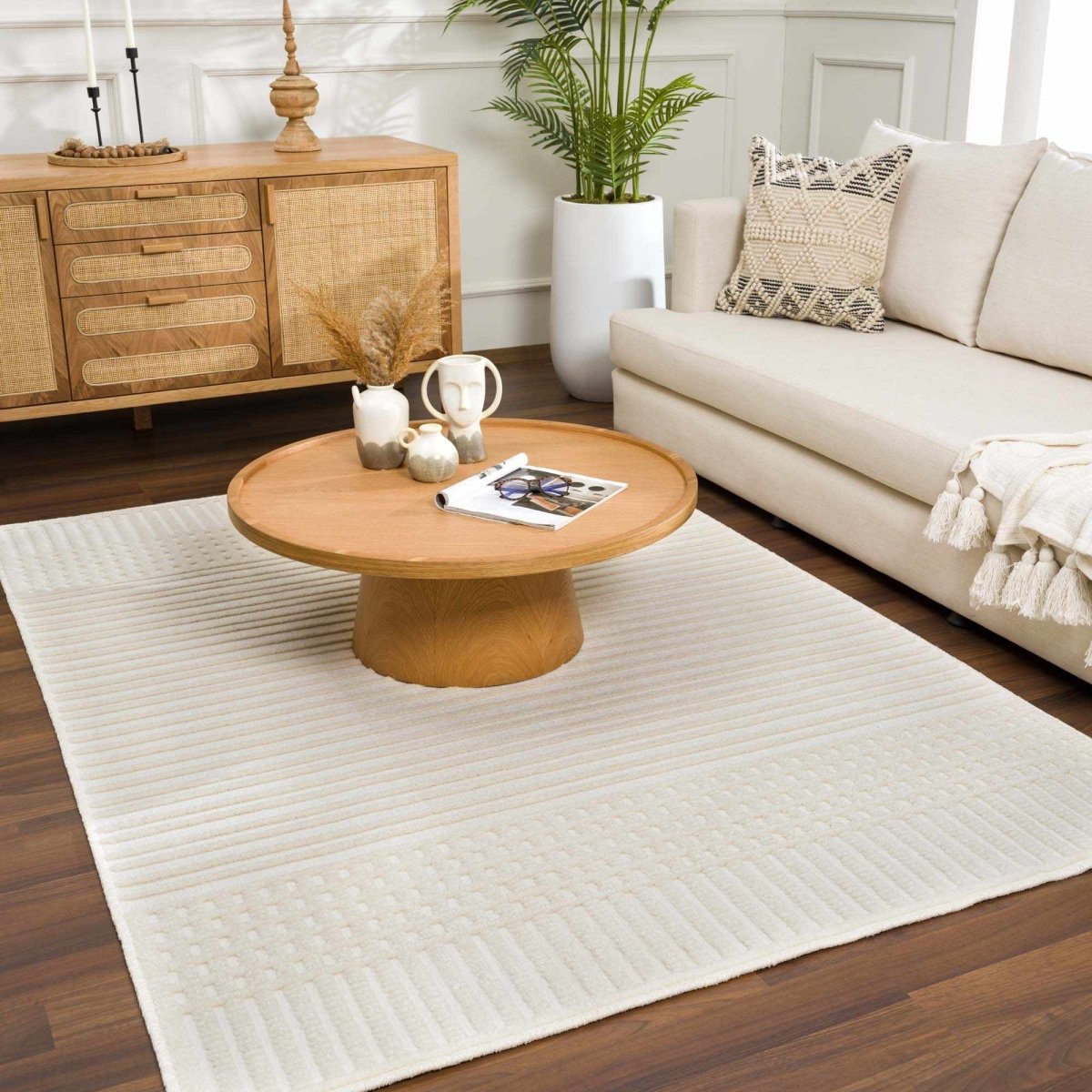 With a pile height of 0.31 inches, this medium-pile rug provides comfortable cushioning underfoot without being too plush. The contemporary styling features subtle variations between white and off-white tones, creating visual interest while maintaining versatility. This neutral color palette works seamlessly with various decor styles and color schemes.