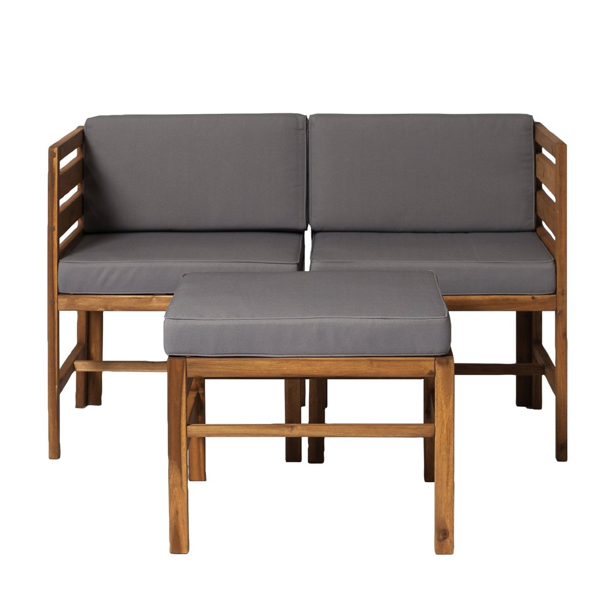 Create a cozy chat set or a chaise-like bench with this three-piece modular patio set that includes two corner chairs and one ottoman. The cushions are three-inches, have removable UV resistant cushion covers, and hook and loop fasteners to keep them securely in place. The naturally weather-resistant solid acacia wood frame should be treated with teak oil every 2-3 months to maintain its vibrant color and durability.