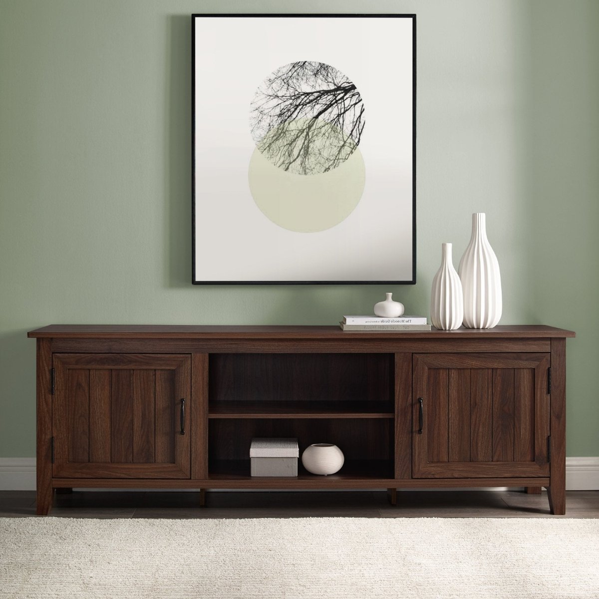 Regular price $127.00Improve your living space with our 70-inch modern farmhouse console, as it’s both practical and stylish. This TV stand features two bead board designed side doors with adjustable shelving inside and in the center of the piece. Constructed of high-grade MDF, along with having exposed metal hardware for an overall modern farmhouse and coastal style. This versatile piece can be used in your living room as a centerpiece and storage unit to decorate with nautical themed décor or as an entertainment center for placing your TV on to watch your favorite shows with friends and family. Either way, this console table will give you just the right amount of space needed for your items and be a stylish addition to your space.