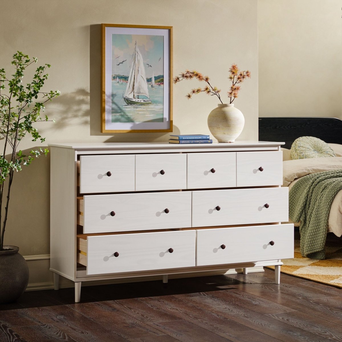 Regular price $460.00Add a classic touch to your bedroom, with our Spencer Nightstand and Dresser Collection. Crafted from solid pine and manufactured wood, with a painted finish, rooted in traditional style. Features centered knobs on each drawer, stained for a long-lasting finish, and short, tapered legs. Its simple style makes it easy to work with a variety of other styles, including transitional and modern. You’ll have easy access to your phone, alarm clock, and lamp by positioning this nightstand next to your bed.